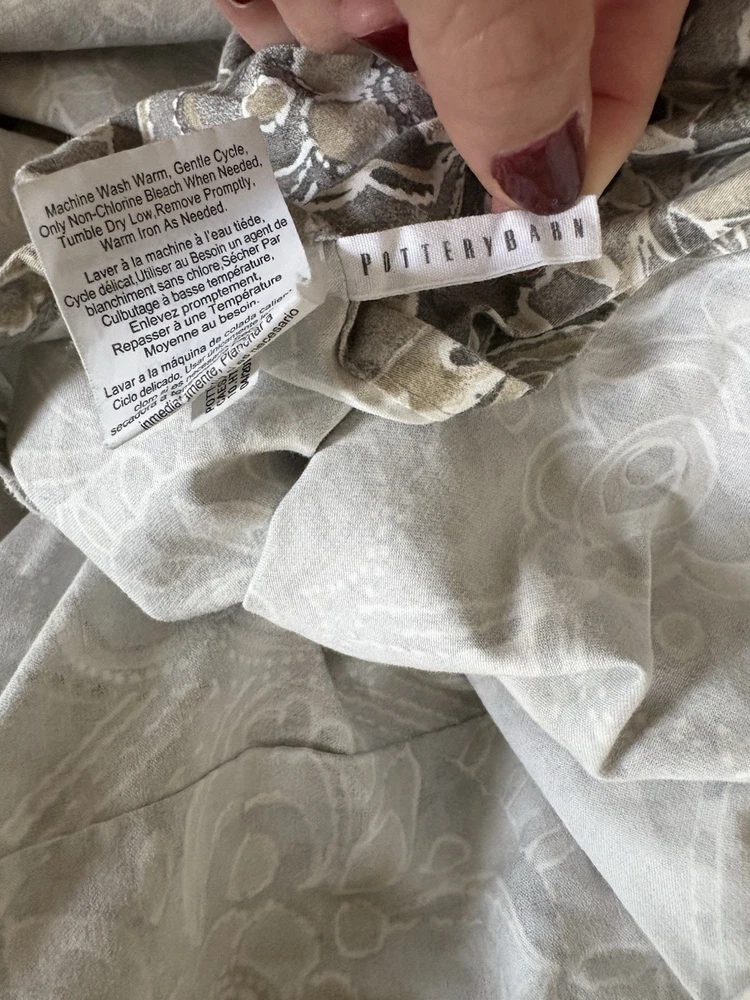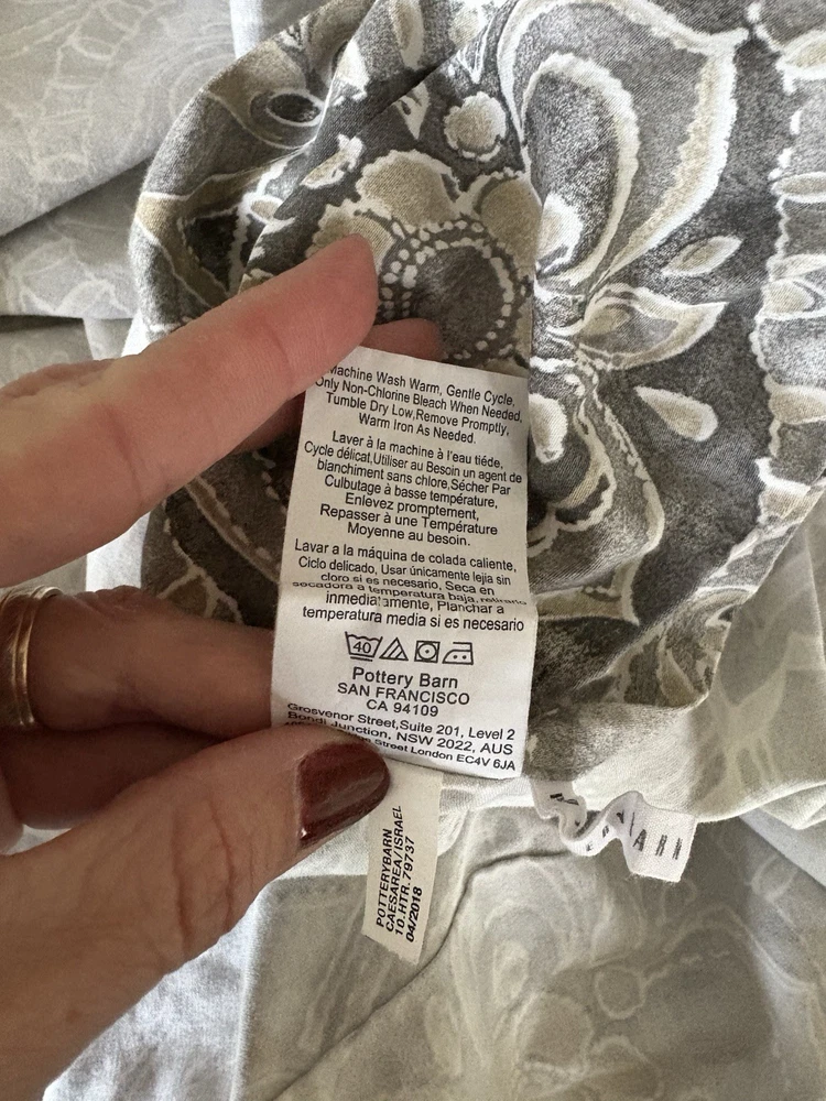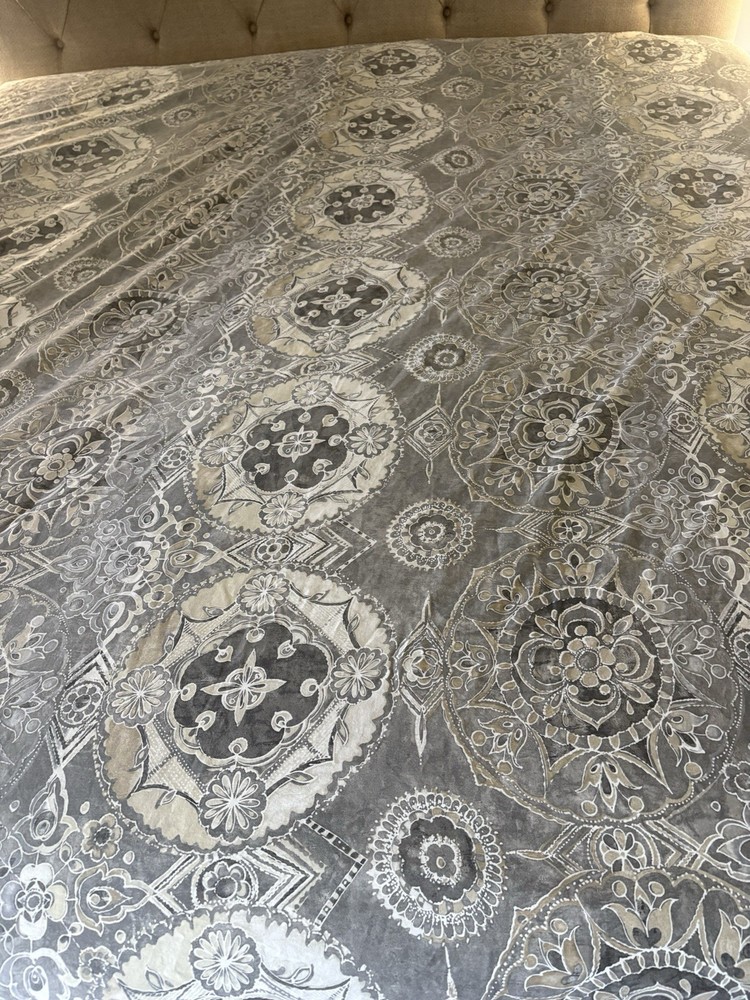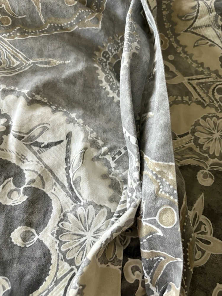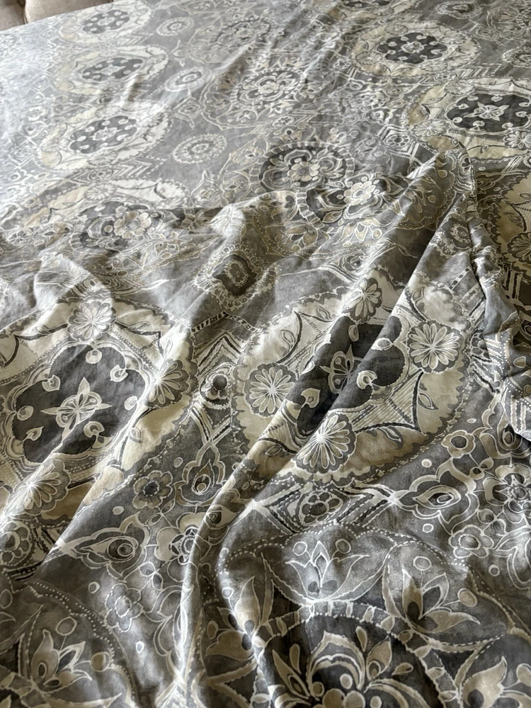 The Pottery Barn Jacquelyn Medallion Duvet Cover in Gray is a luxurious addition to any bedroom. Made from 100% cotton, this king-sized duvet cover features a beautiful medallion pattern in a soothing gray color. With a roomy length of 104 inches and width of 90 inches, this duvet cover from the Pottery Barn Jacquelyn collection is both stylish and comfortable. Easy to care for with machine wash instructions, this duvet cover is a perfect choice for anyone looking to add a touch of elegance to their bedroom decor. The measurements were approximate laying flat on the king size bed. There are no visible flaws.