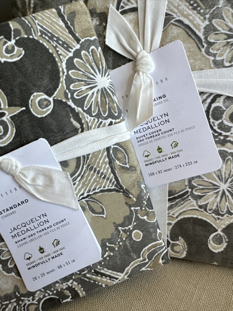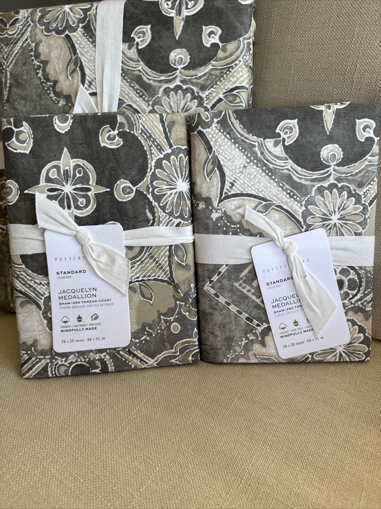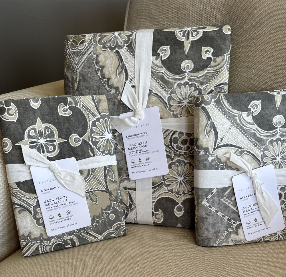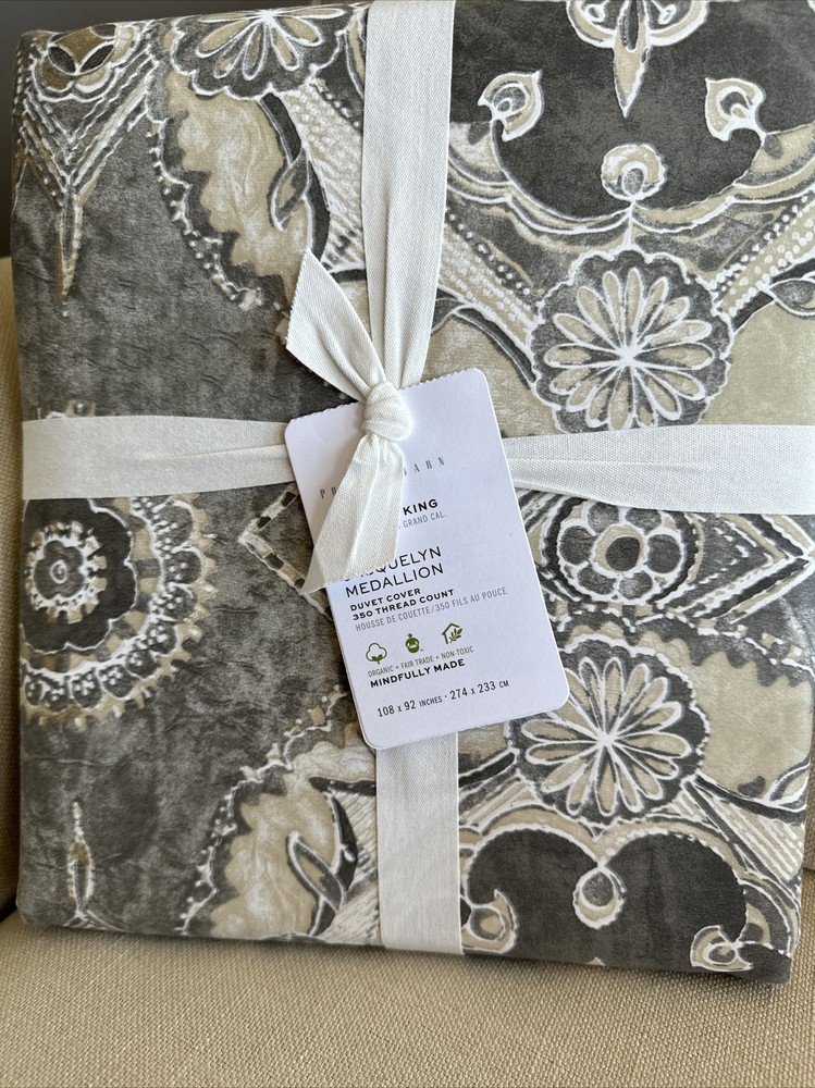 Pottery Barn Pottery Barn, a division of Williams-Sonoma, provides casual furnishings and textiles designed to delight and inspire the imagination. King / Cal King Duvet Cover & 2 Standard Pillow Shams Fabric: 100% Cotton Sateen, 350 Thread Count Care: Machine washable This posting is for a duvet cover and 2 pillow shams, the insets and other items are not included. The photo's are of the actual item(s) Please ask all questions prior to purchase Stored in a smoke free environment Photos: We try our best to adjust the lighting to capture colors accurately; however colors can differ in photos depending on lighting and the devise used for viewing. Before purchasing, we recommend reviewing the item on the products website. Shipping: Shipping is offered to the confirmed address on record. Please make sure the shipping address is accurate before making a purchase. For your convenience tracking numbers are uploaded to eBay once shipped. Product may be shipped with Signature Confirmation. Returns: Please contact us if there is a problem with the item(s) you receive within 14 days of receipt of the item. Refunds are offered if returned in the original package (as packaged by the manufacture), unused and with tags attached. Shipping costs will be subtracted from the refund. International Shipping: eBays Global Shipping Program is offered for International Shipping. Import duties, taxes and charges are not included in the item price or shipping costs. These charges are the buyer's responsibility. Please check with your county's customs office to determine what these additional costs will be prior to bidding or buying. Thank you for looking!