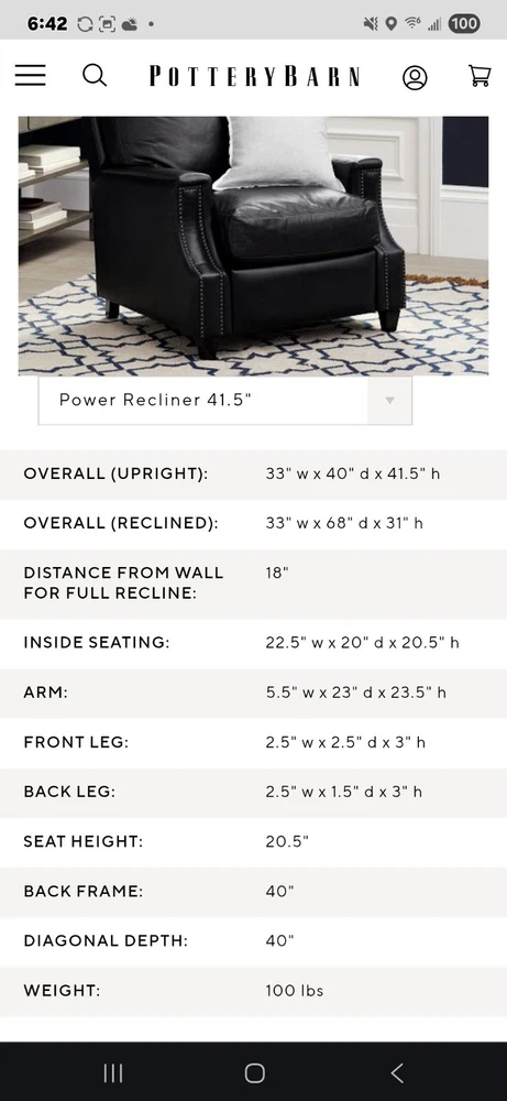 The Pottery Barn (James) Leather Electric Recliner is a traditional-style brown (espresso) leather recliner, measuring 41.5 inches in height, 40 inches in depth, and 33 inches in width. It features an electric recliner function and adjustable features, making it a comfortable and versatile addition to any living room. The Pottery Barn James model is known for its high-quality construction and timeless design, perfect for relaxing and unwinding in style. USB charging feature