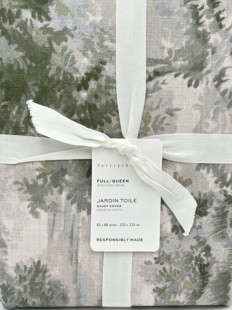 New~Pottery Barn~ Jardin Toile Duvet ~Full Queen ~Green Brand New Full Queen Duvet: 88" x 92” Duvet Cover Only Classic toile is given a painterly hand in this luxurious duvet. The soothing palette brings incredible versatility and effortless style. Woven of cotton, it’s invitingly soft and cool to the touch. For a classic look, pair it with textures and coordinating hues. Made with 100% cotton. Reverses to same. Duvet features a hidden zipper closure with inner ties that keep insert in place CARE Machine wash on warm. Please read our RETURN POLICY before you purchase: We take pride in our business, and we strive to do our best. We purchase brand new items and we do our best to give accurate descriptions and photos. If you have any questions about an item, please contact us through eBay prior to your purchase. We try our best to resolve any issues as fast as possible. If there are any issues with your item, please contact us right away. All items being returned must be returned with the price tag attached or new in package. No used items can be returned. When we receive the returned item, inspect it, and it is found to be in the same condition that we shipped it in (brand new, unused and in the original packaging) your refund will be given. The buyer is responsible for paying the return shipping. Thank you! Feedback: We strive to give you the best service. If you have any issues regarding your item, please contact us right away. Customer satisfaction is our priority. See my other listings for more great items! We accept Visa, Mastercard, Discover, American Express, Apple Pay and Google Pay. We will ship to the address provided at payment. We provide fast shipping! Your item will be shipped within 2 business days via UPS or USPS priority mail. Fed Ex and UPS can NOT deliver to PO boxes, so please provide us with a physical street address. Once your item is shipped, you will receive an email with your tracking number. Free Shipping is excluded for HI, PR and AK. Please email us for shipping rates to HI, PR and AK. Additional Shipping required for HI, PR and AK. Shipping rates don't include HI, PR and AK. Please contact us for shipping prices before you purchase. Thank you. txzj pxzj5515 txzj39