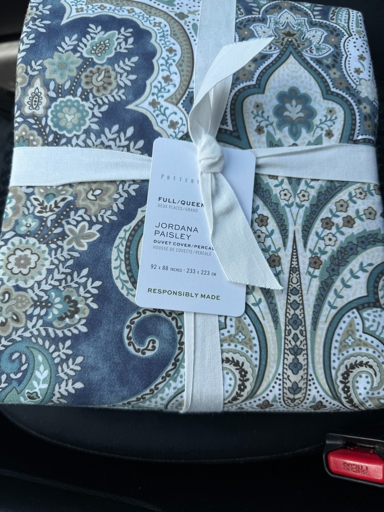 PB Jordana Paisley Printed Duvet Cover, size Full/Queen, brand new. Construction Made of 100% cotton percale. Duvet cover and sham reverses to self. Duvet features a hidden button closure with inner ties that keep the insert in place; sham features an envelope closure. Duvet cover and insert sold separately. Shams sold individually. OEKO-TEX® STANDARD 100: tested against 1000+ harmful substances. 14.HUS.42449 HOHENSTEIN. Imported. Care Machine wash in warm water; gentle cycle with like colors. Only non-chlorine bleach when needed. Tumble dry on low heat; remove promptly. Warm iron as needed. Dimensions Full/Queen: 88" l x 92" w King/Cal. King: 92" l x 108" w Listing is for duvet cover only, no shams included