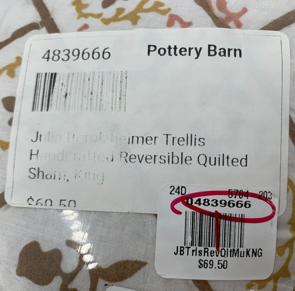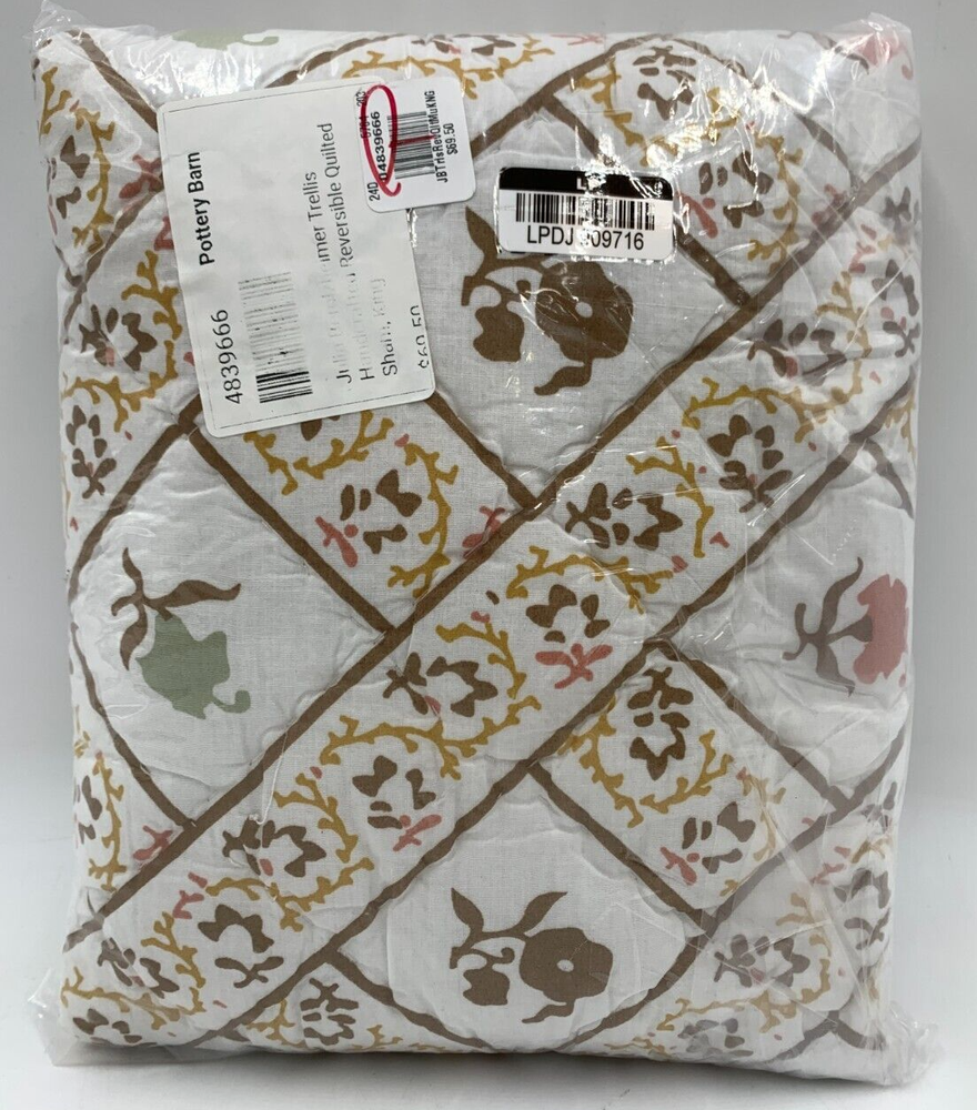 Pottery Barn Julia Berolzheimer Trellis Handcrafted Quilted Sham Item is brand new Auction includes: 1 sham PRODUCT DETAILS CONSTRUCTION: Made from 100% cotton. Reverses to 100% cotton in coordinating pattern. Filled with 100% polyester batting. Sham features a zipper closure and reverses to Green. This item has been ethically handcrafted to the Nest Standards, ensuring the social and environmental protections of workers in home or small workshop-based production. Shams sold individually. Quilt, shams and inserts are all sold separately. Imported. Standard Sham: 20" h x 26" w Euro Sham: 26" sq King Sham : 20" h x 36" w CARE: Machine wash in warm water; gentle cycle. Only non-chlorine bleach when needed. Tumble dry on low heat; remove promptly. Warm iron as needed.