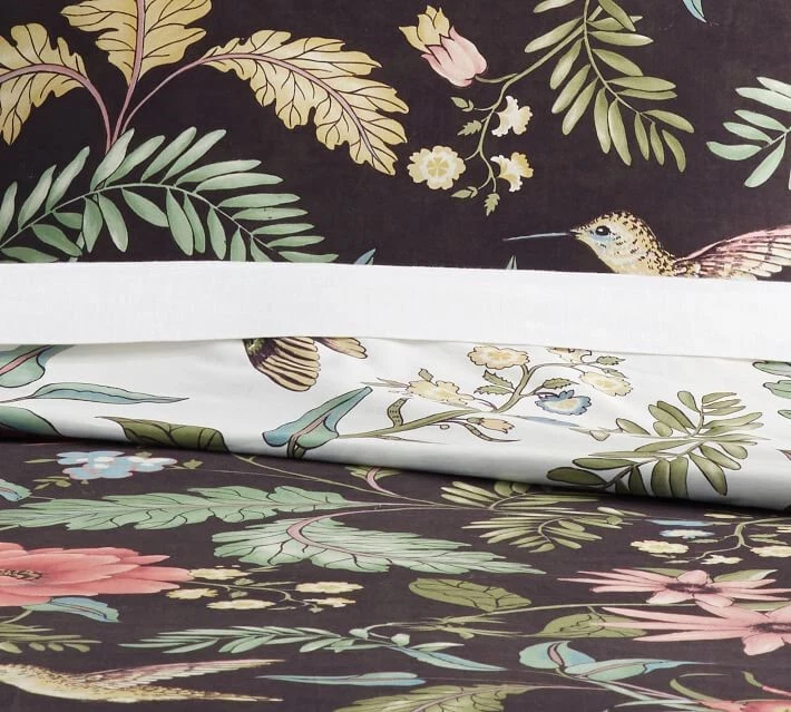 The Pottery Barn KARINA Reversible Queen Duvet and two standard shams feature a vibrant hummingbird and flower pattern. Made of 100% cotton percale, it reverses to a black background for a versatile look. The set is machine washable. Comes from a smoke-free, pet-free home. Thank you for looking. Feedback from buyers: * "The seller could not have made it any easier to make a purchase. The communication concerning the status of shipping and any follow up questions was quickly answered. This is what real customer service feels like. I would purchase from this seller again!" * "So so sorry for the belated feedback. This was the best seller I have ever encountered on eBay or anywhere for that matter, so kind, thoughtful, personable, accommodating. Went out of her way to get me the items even faster than ASAP w/out upcharge. Everything was pristine, beyond perfect, impeccably wrapped, I am so grateful and was thrilled to have the items needed for my first post COVID dinner party. She is a model for all sellers, her customer service is beyond compare, incredible actually."