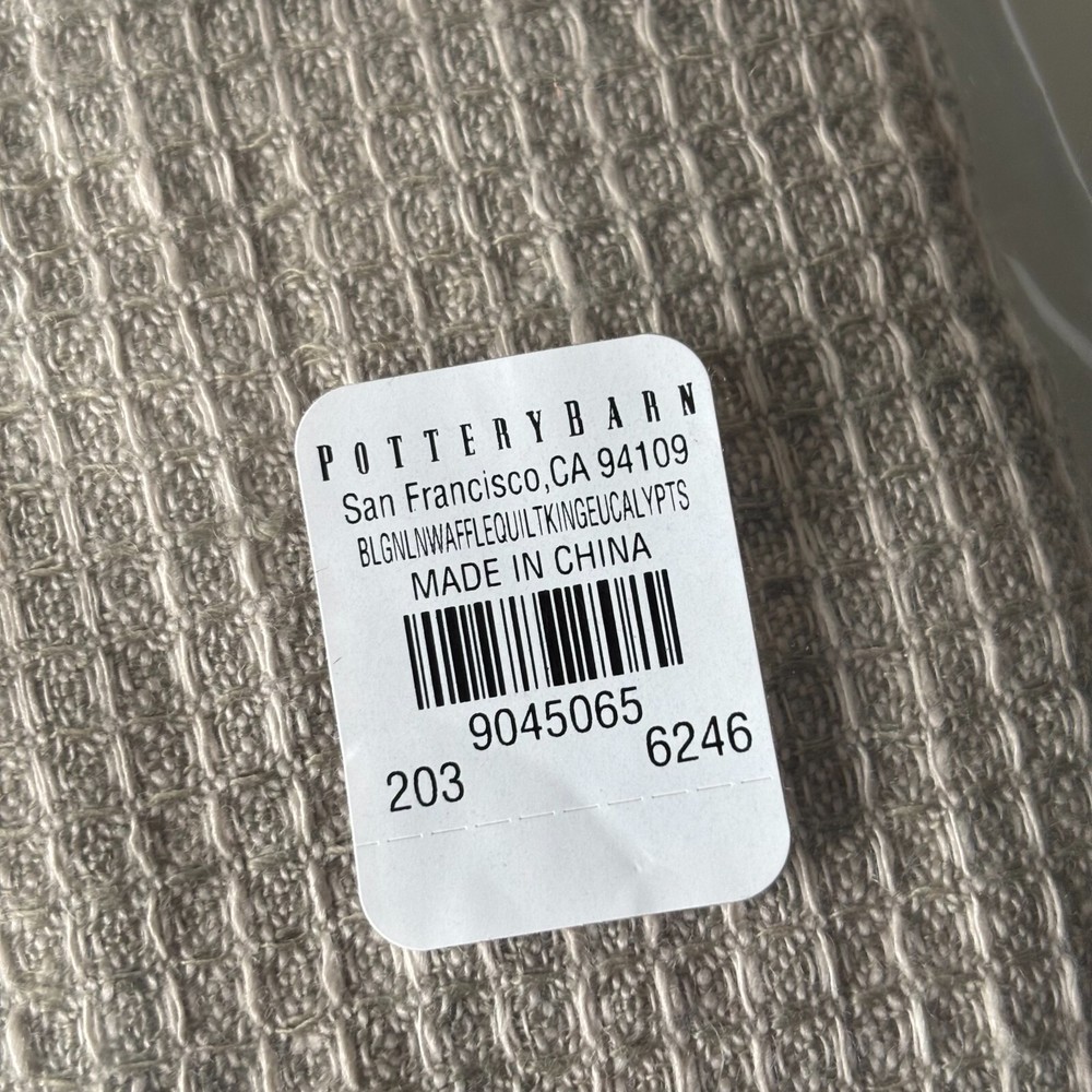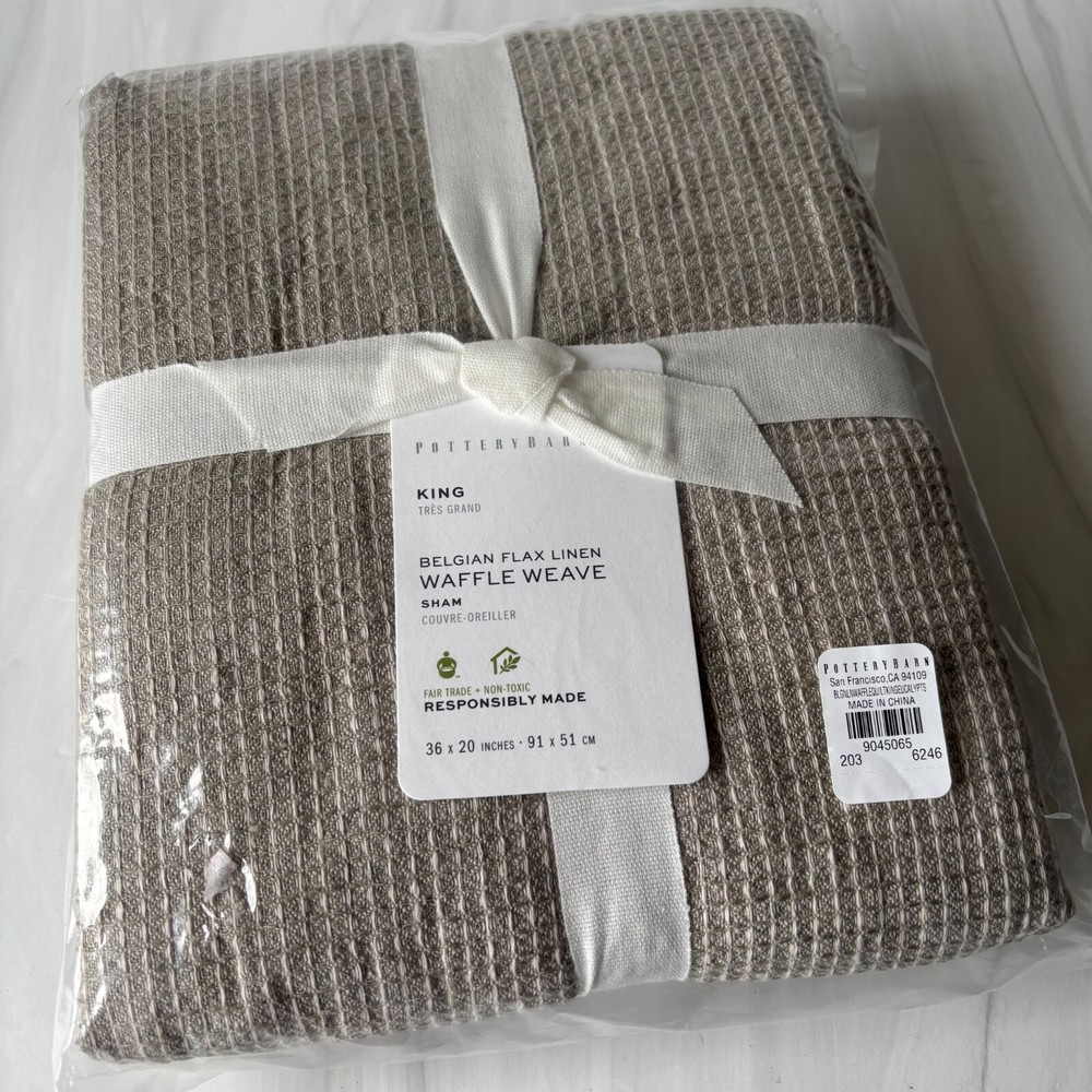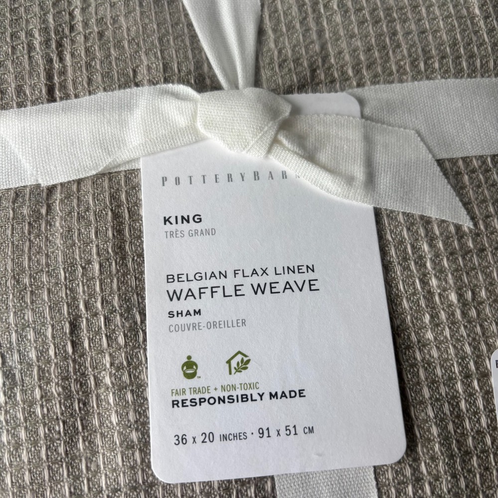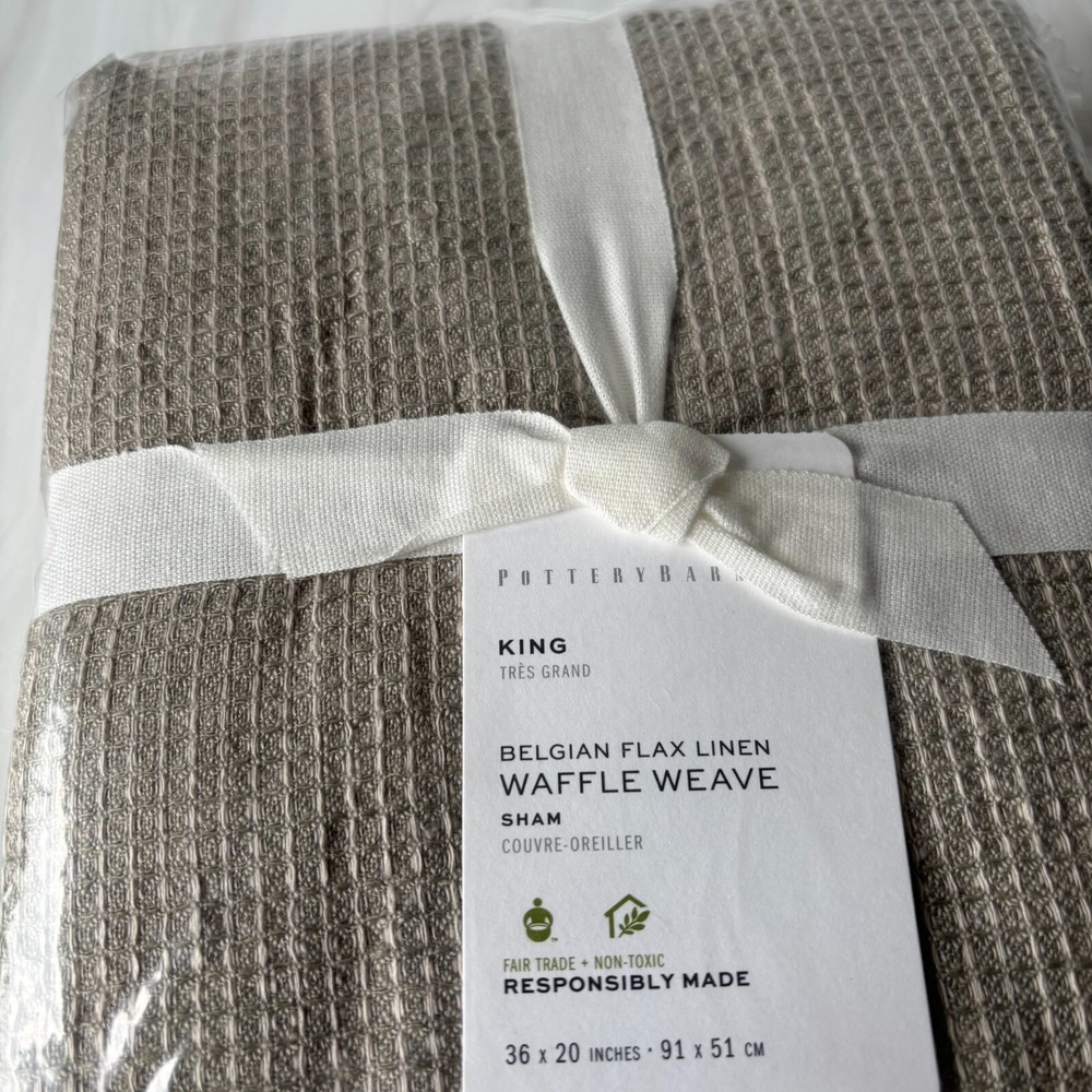 The Pottery Barn KING Belgian Flax Linen Waffle Weave Sham is a stylish and modern addition to any bedroom. Made of high-quality Belgian flax linen with a beautiful waffle weave pattern, this King-sized sham is in a soothing eucalyptus color. The rectangular shape and 36" length make it perfect for King-sized beds, and the machine washable feature ensures easy care. Add a touch of elegance to your bedding with this Pottery Barn sham, ideal for teens and adults alike.