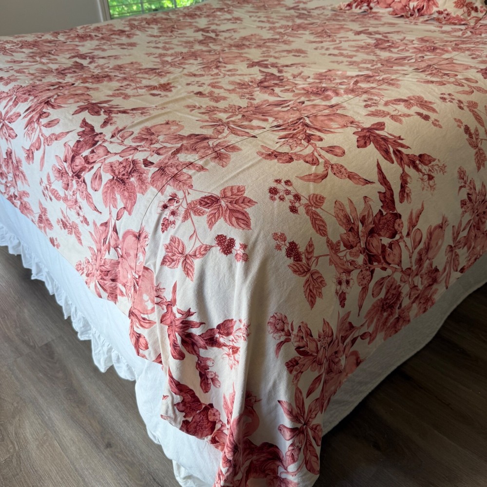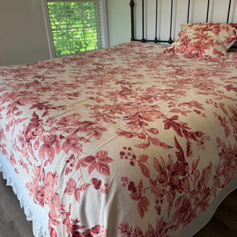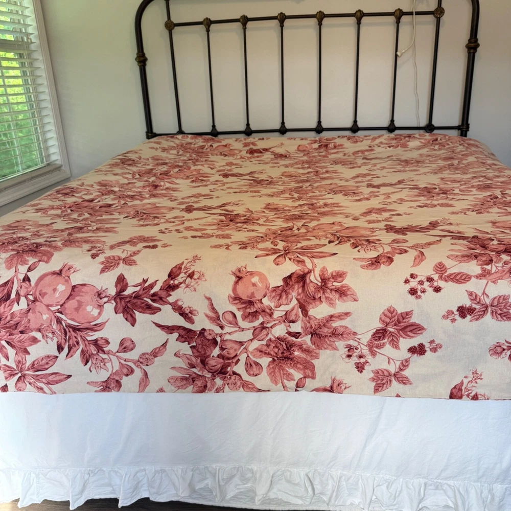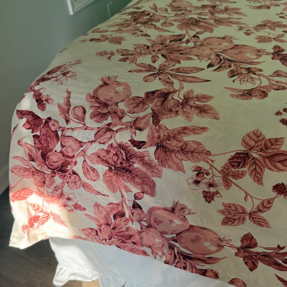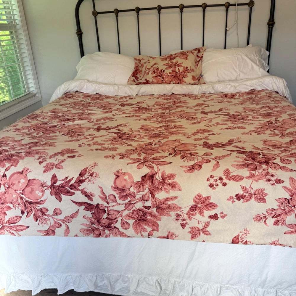 Beautiful Pottery Barn Lisette King size Linen / Cotton Duvet cover with 1 sham (plus another sham thrown in free due to a damaged corner, but could be made into a throw pillow very easily, as shown in pics.) I have shown both sides of the duvet, the first pictures are side 1, and the pictures with the bed made with white linens are side 2. The other white linens and pillows in the photos are not included, just used to show how pretty this pattern is used with white linens. you will get one King size duvet cover, both sides are the same. 1 Standard pillow sham, and another standard pillow sham thrown in free of charge, due to the damage on one corner. It can be used to make a throw pillow, though. No major damage, just slight fading from washing, and minor pilling in a few small spots, not all over. The Sham looks like it is a bit brighter, with no fading, as it hasn't been washed as frequently as the duvet. All are clean and ready to go. Please ask if you need more pics, or any questions you may have! Thank you! Please see all pictures.