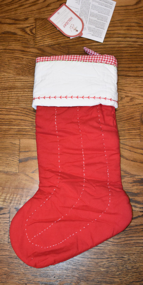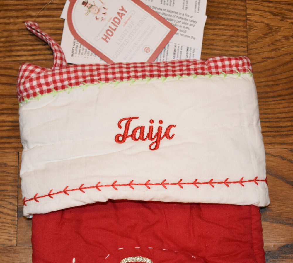 Stocking has Taijc embroidered with red thread. Overall: 8.5" wide x 20" long Cuff: 5.5" high Length from top of cuff to heel: 16" long Length from heel to toe: 11" long Hanging Loop: 3" long Requires: 3 AA batteries (not included) LED Bulb: 8 included Weight: 0.5 pounds CARE Spot clean with soft, damp cloth. Blot to remove excess water. Air dry. If storing remove batteries and replace with brand new one when used again. Stockings have 3 way switch with on/off/timer. Timer can run the lights for 6 or 18 hours. Made from 100% cotton sheeting, lined with 100% polyester and filled with 100% cotton batting. Cuff is made of 100% cotton sheeting. Stocking is yarn-dyed – fibers are treated individually with environmentally safe dyes before weaving to offer vibrant, lasting colors.
