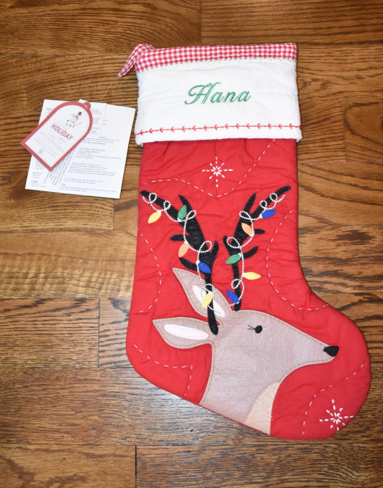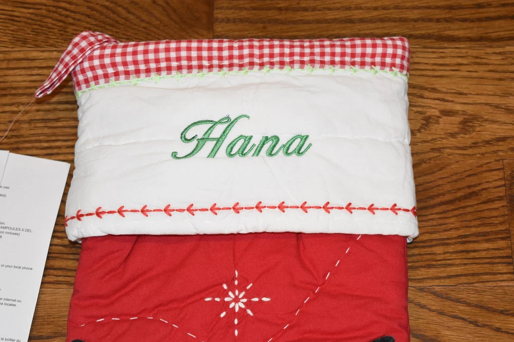 Stocking is monogrammed "Hana" in green thread. Overall: 8.5" wide x 20" long Cuff: 5.5" high Length from top of cuff to heel: 16" long Length from heel to toe: 11" long Hanging Loop: 3" long Requires: 3 AA batteries (not included) LED Bulb: 8 included Weight: 0.5 pounds CARE Spot clean with soft, damp cloth. Blot to remove excess water. Air dry. If storing remove batteries and replace with brand new one when used again. Stockings have 3 way switch with on/off/timer. Timer can run the lights for 6 or 18 hours. Made from 100% cotton sheeting, lined with 100% polyester and filled with 100% cotton batting. Cuff is made of 100% cotton sheeting. Stocking is yarn-dyed – fibers are treated individually with environmentally safe dyes before weaving to offer vibrant, lasting colors.