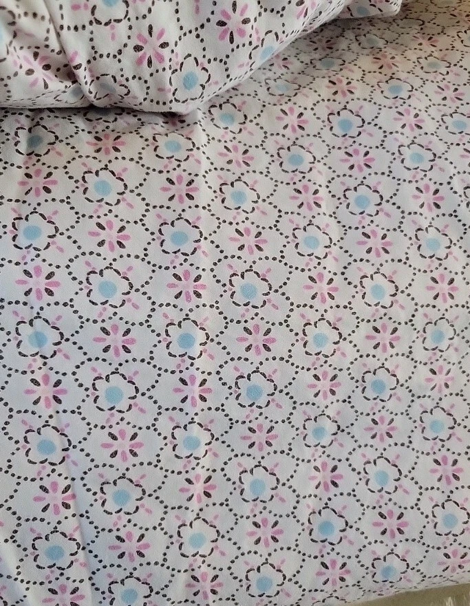 Absolutely love this charming sheet set! The pink and blue floral design is so sweet and cheerful—perfect for a cozy bedroom. The fabric is soft, well cared for, and in great condition with no flaws. The elastic still fits snugly, and having both flat and fitted sheets plus two pillowcases is a fantastic deal. Super happy with this purchase—adorable and practical!