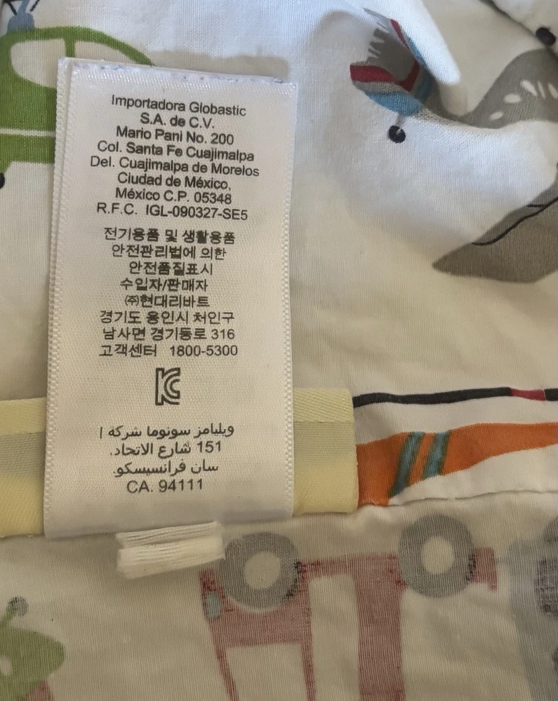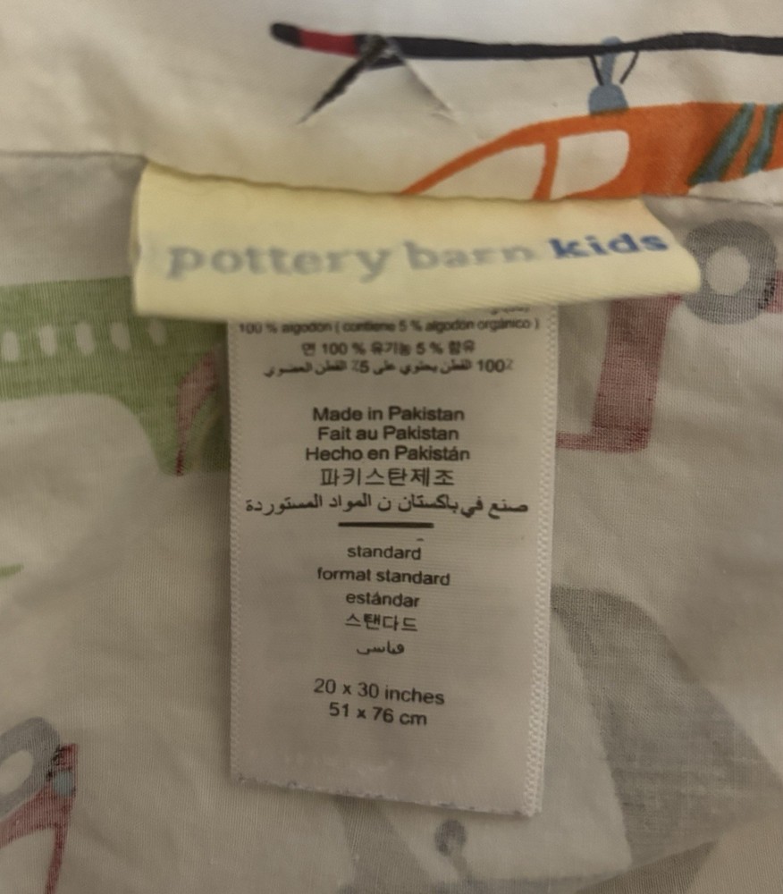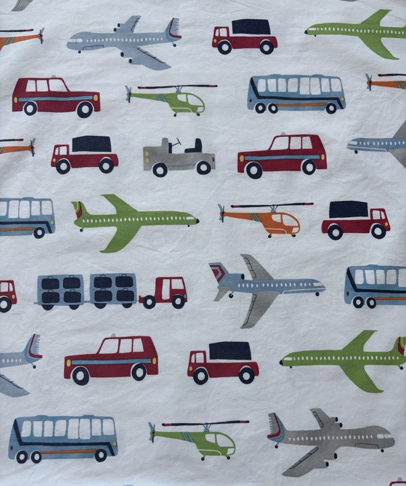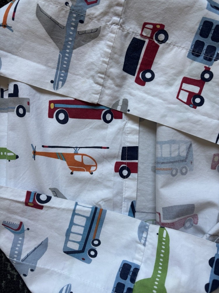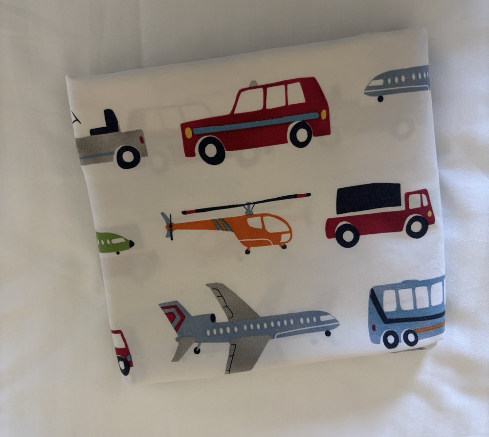 Pottery Barn Kids standard pillowcase/sham in their Brody design - colorful transportation vehicles like trucks, buses, cars, helicopters, and planes. The fabric is 100% cotton and has been freshly laundered and ironed.