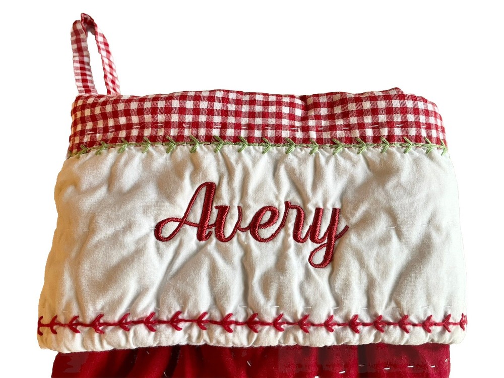 Super cute quilted Pottery Barn Kids Christmas stocking embroidered with the name ‘Avery’. Freshly laundered and in EXCELLENT CONDITION. Measures approx. 23” long by 13” wide. Rich red and pure white cotton colors with pink velvet, green corduroy and white fleece accents … ADORABLE! Fabulous PBK QUALITY. SPEEDY SHIPPING