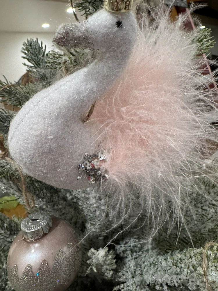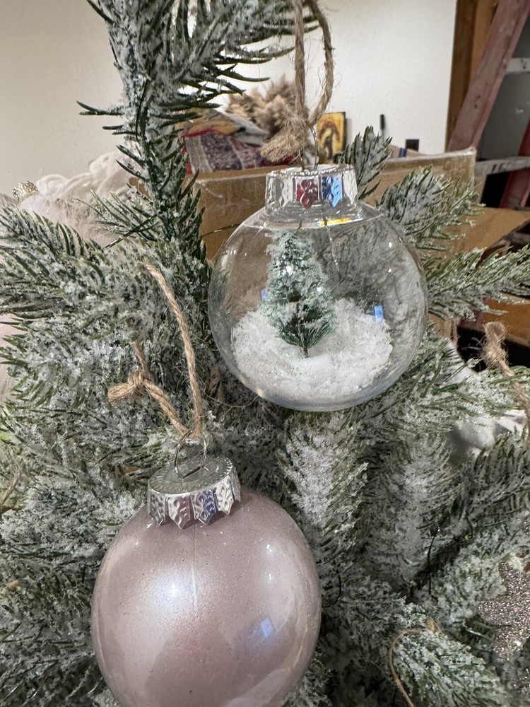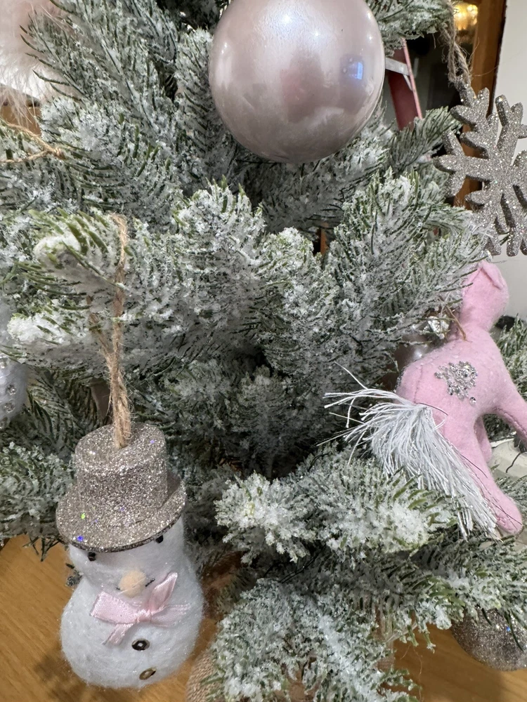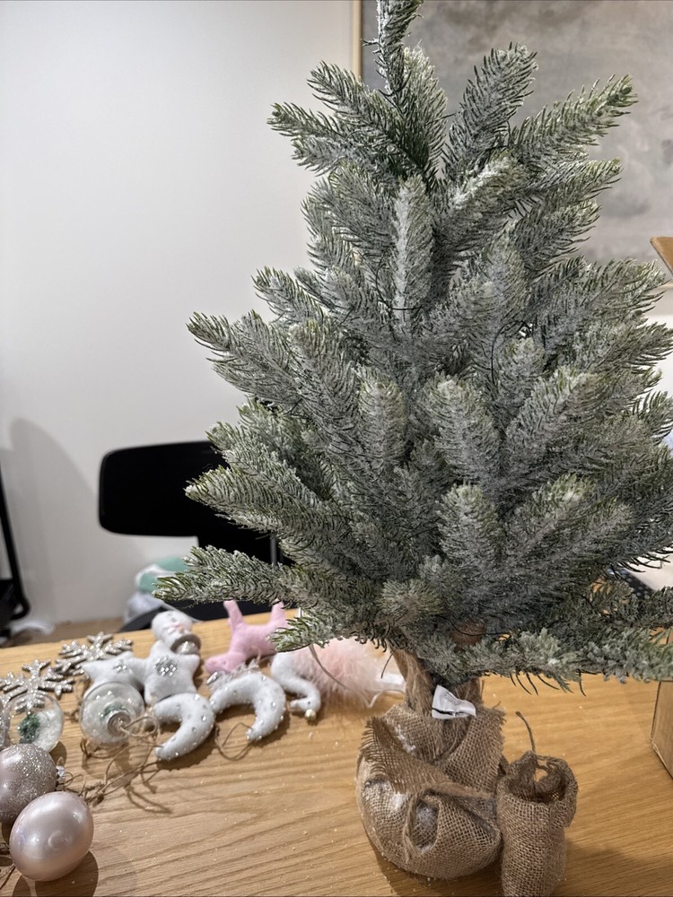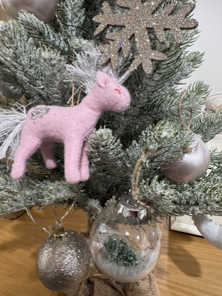 READ Some ornaments are DIFFERENT then those listed There are extras and some missing Clip star topper 2 sparkle stars 2 felt sequin moons 2 snowflakes 1 swan 1 unicorn 1 snowman 2 tree globes 2 plastic sparkle balls 2 shiney pink plastic balls 2 shiney sparkly pink plastic balls 1 ballet slipper Let little ones discover the holiday spirit with a tiny Christmas tree of their own. Crafted to resemble real evergreens and crowned with a silver star, ours features 28 dimensional branches ready to display their favorite decorations. Strung with 45 LED bulbs, it casts a warm glow on a tabletop Ornaments Tree is made of PE, plastic, wire and cement. Hardware and trim are made of polyresin and plastic. Tree branches are slightly bendable.