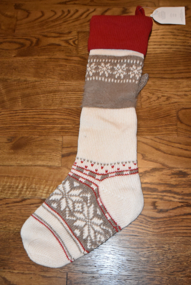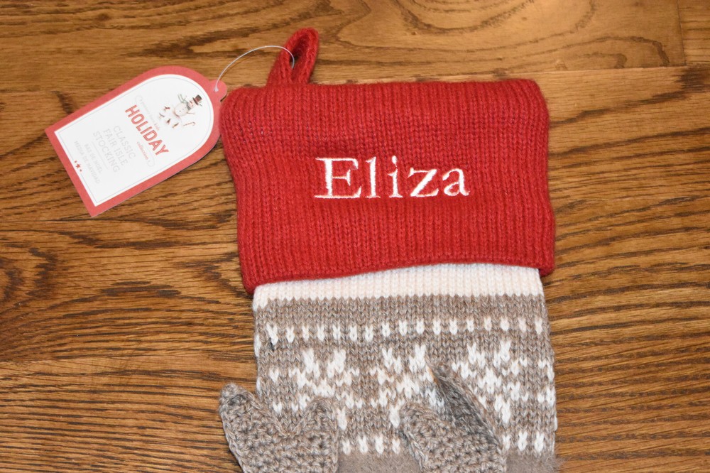 Has the monogram "Eliza" with white thread Classic Fair Isle Stocking Overall: 11" wide x 27" long Cuff: 4.5" high Length from top of cuff to heel: 21" long Length from heel to toe: 11" long Hanging Loop: 3" long Weight: 0.5 pounds CARE Spot clean with soft damp cloth. Blot to remove excess water. Air dry. Made of 55% wool and 45% polyester. Lining is made of 80% polyester and 20% cotton. Stocking is yarn-dyed – fibers are treated individually with environmentally safe dyes before weaving to offer vibrant, lasting colors.