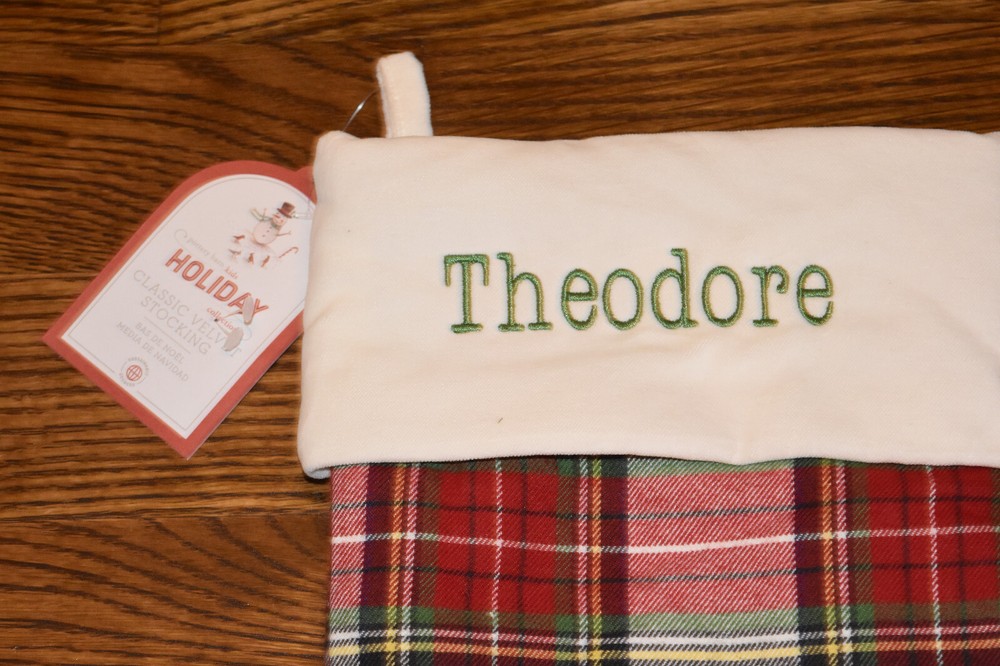 Has Theodore monogram in green thread DIMENSIONS Overall: 8.5" wide x 20" long Cuff: 5.5" high Length from top of cuff to heel: 16" long Length from heel to toe: 11" long Hanging Loop: 3" long Weight: 0.5 pounds Made from 100% cotton velvet and filled with 100% polyester batting. Cuff is made of 100% cotton velvet. Stocking is yarn-dyed – fibers are treated individually with environmentally safe dyes before weaving to offer vibrant, lasting colors. KEY PRODUCT POINTS Pottery Barn Kids exclusive. Spot clean. Imported.