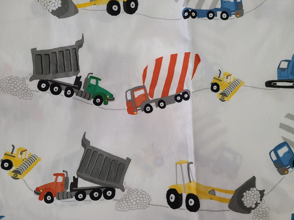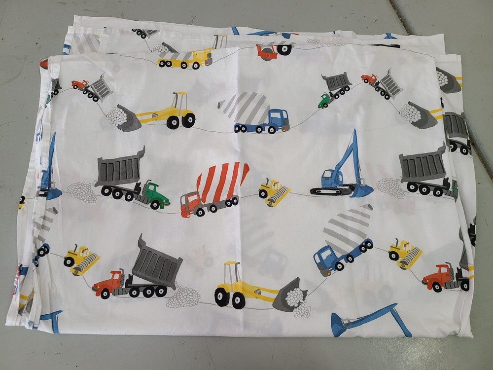 In very good condition, 100% cotton; white with construction vehicles; Will combine shipping for multiple items. Thanks for looking. All items are sold "AS IS" , they are pre-owned unless otherwise stated and will need to be washed ; if you have any questions about the item please ask before purchasing; No refund will be given on a missing part, wrong colors (ex. White not as white as customer wants), wrong pattern, dirt (I live in the desert so it's inevitable – it washes right out), size, grease pencil marks or tag holes. I try to describe item the best that I can and supply numerous photos, please look at photos closely -- I will be more than happy to take different photos, measurements, etc. if needed for you. Thanks for looking!
