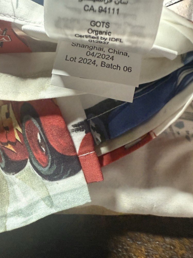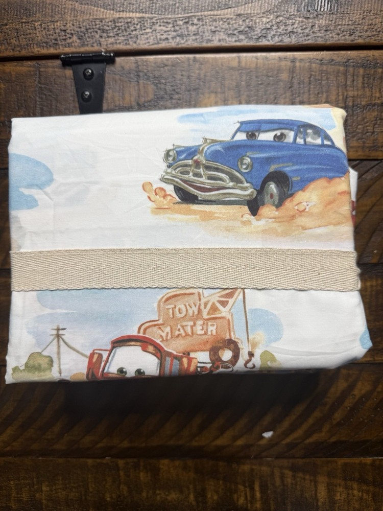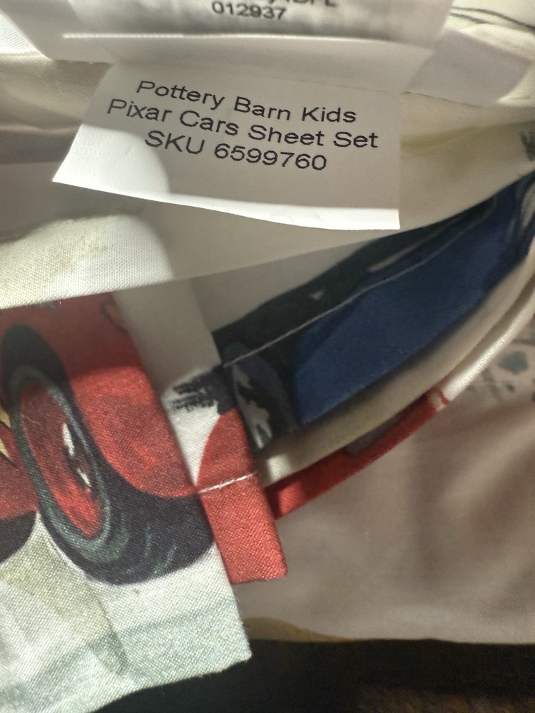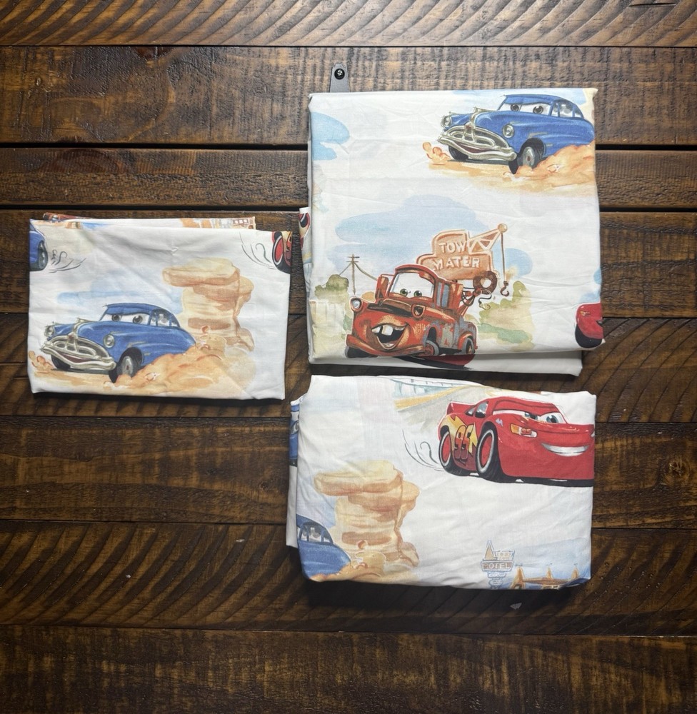 This is a nwot item Flat Sheet: 45" wide x 65" long Fitted Sheet: 26" wide x 53" long; fits mattresses up to 8" deep Toddler Pillowcase: 24" wide x 16" high The Pottery Barn Kids Disney & Pixar Cars Organic Toddler Bed 3 Piece Sheet Set is a colorful and fun bedding set perfect for young fans of the Cars franchise. Made from 100% cotton with an Öko-Tex Standard certification, this set includes a pictorial pattern featuring characters from the Disney and Pixar Cars movies. The rectangular shape and modern style make it a great addition to any toddler's bedroom, and it is easy to care for with machine wash and tumble dry instructions. The set includes a fitted sheet, flat sheet, and pillow case, providing a cozy and stylish sleep environment for any little one.