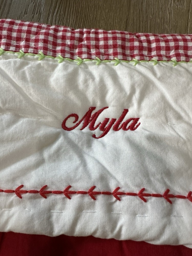 pottery barn kids dog firetruck stocking new with tag but pb kids name has a black line through it on the paper and attached tag Overall: 11" wide x 20" long monogrammed with the name Myla...