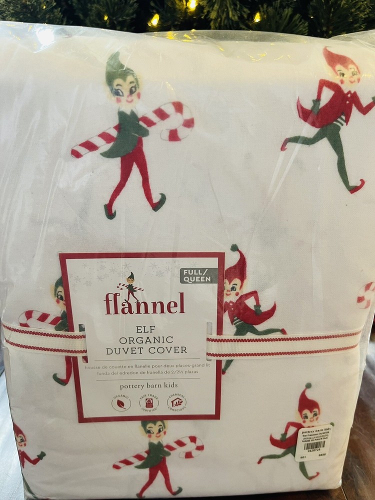 Get ready to invite the holiday spirit into your bedroom with this beautiful Pottery Barn Kids Elf Flannel Cotton FULL QUEEN DUVET 2 Shams Christmas Bedding set. The set includes a festive duvet cover and decorative pillow to brighten up your sleeping space. The flannel and organic cotton materials promise ultimate coziness and comfort, making it a perfect addition to snuggle on a chilly night. This traditional-style set features an Elf pattern and a multicolor palette, making it an ideal selection for the holiday season. The duvet cover set is suitable for a queen-sized bed, and it is an excellent choice for anyone looking to add a touch of glamor to their bedroom. Don't miss out on this fantastic opportunity to welcome the holidays in style.