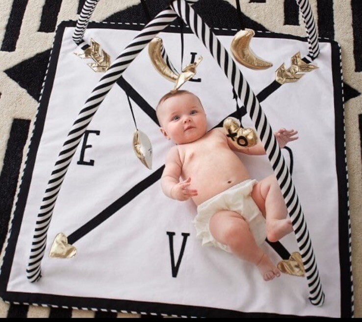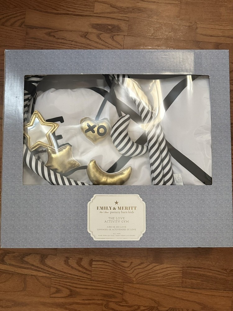 New in box Pottery Barn Kids Emily Merrit Love Activity Gym features a square gray playmat with a "Love" theme, designed for infants. Priced at $129, this baby gym offers a cozy and engaging space for little ones to play and explore.