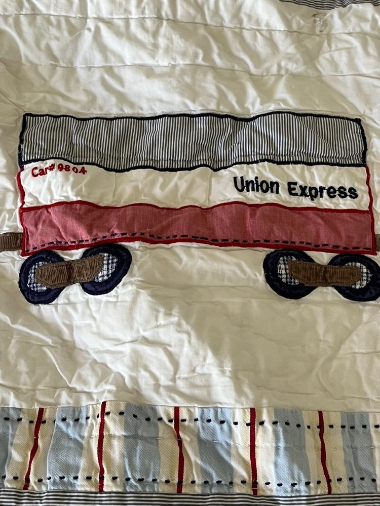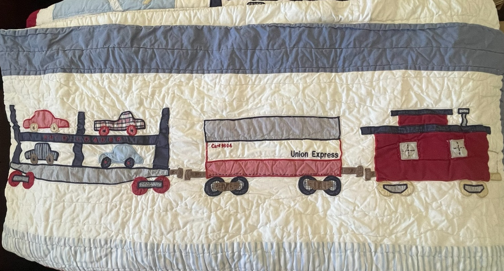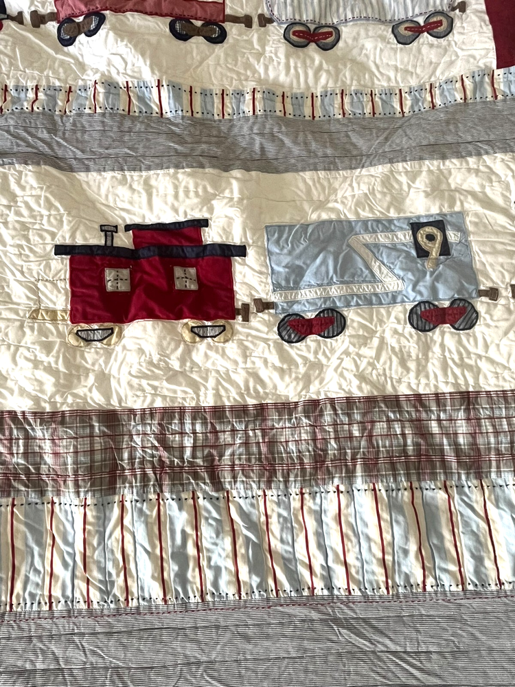 Pottery Barn Kids FULL QUEEN Quilt Vintage Patchwork TRAIN Embroidered 86 x 86 Hard to find, older Pottery Barn Kids Quilt features red, white and blue plaid and striped patchwork, embroidered train cars. Front is in excellent condition, back has a couple small stains.