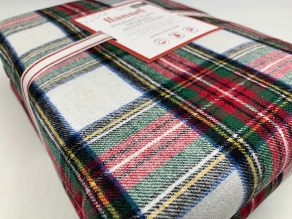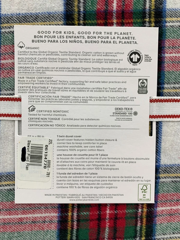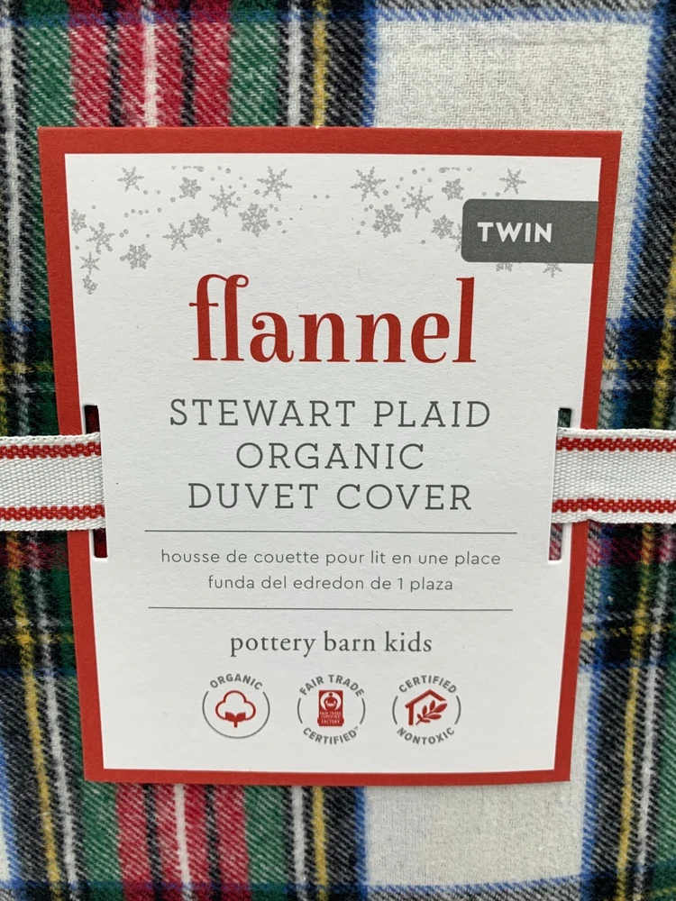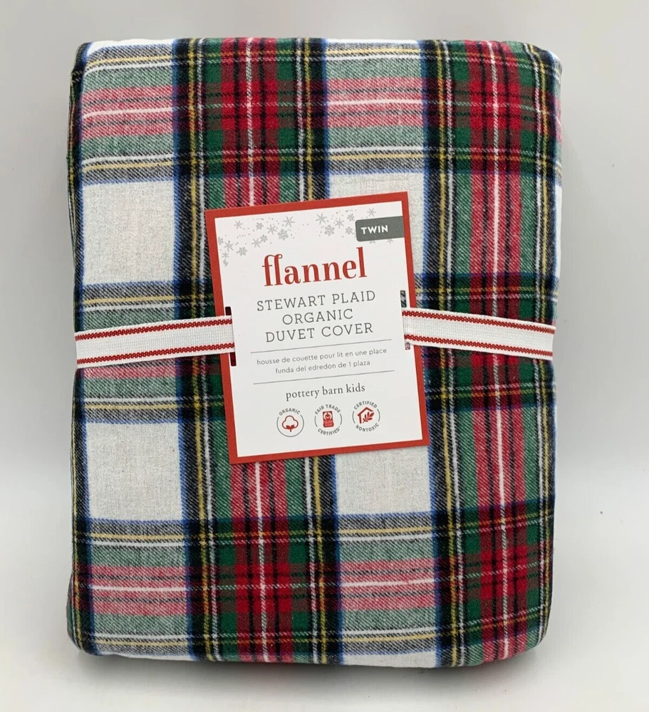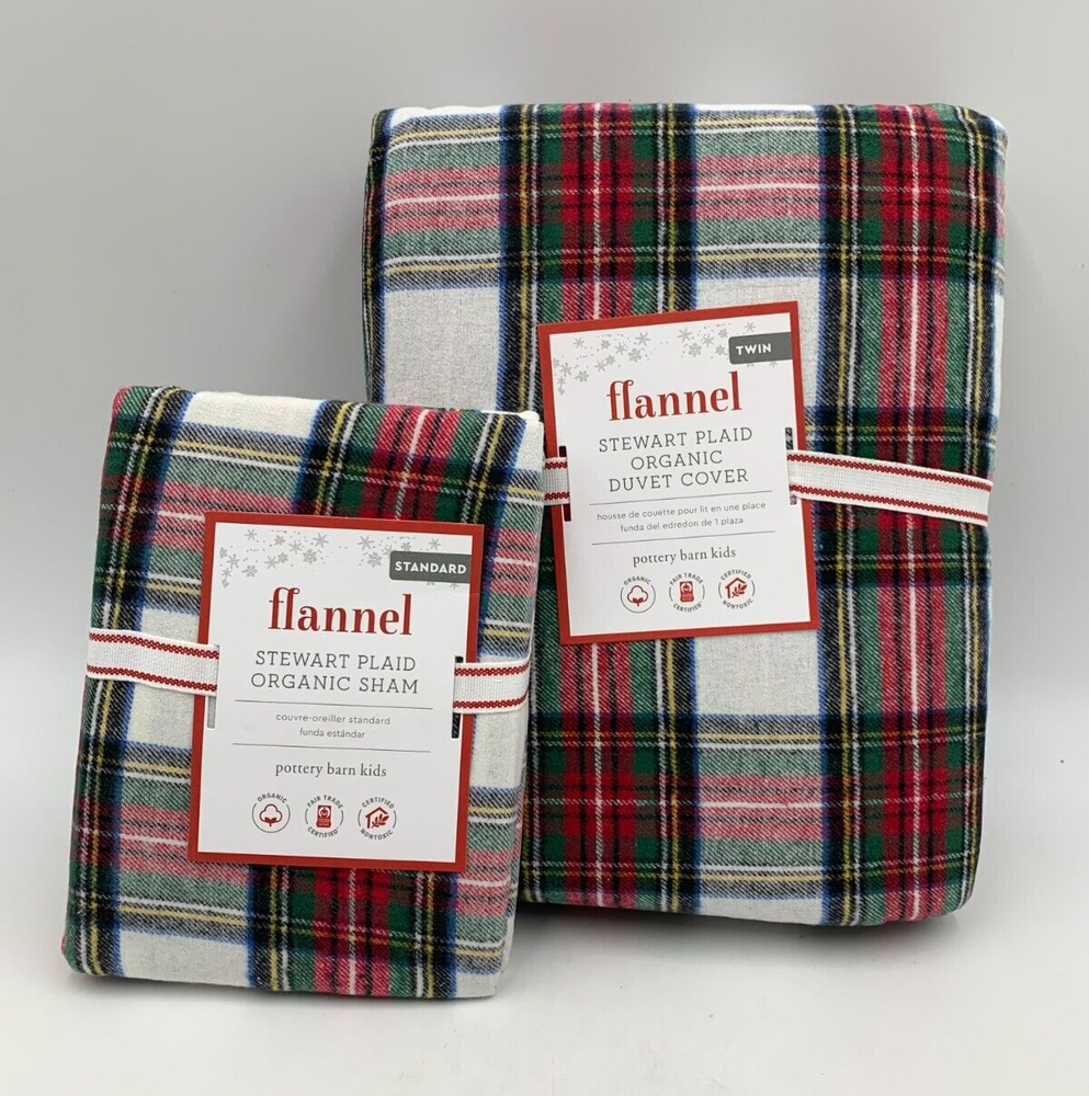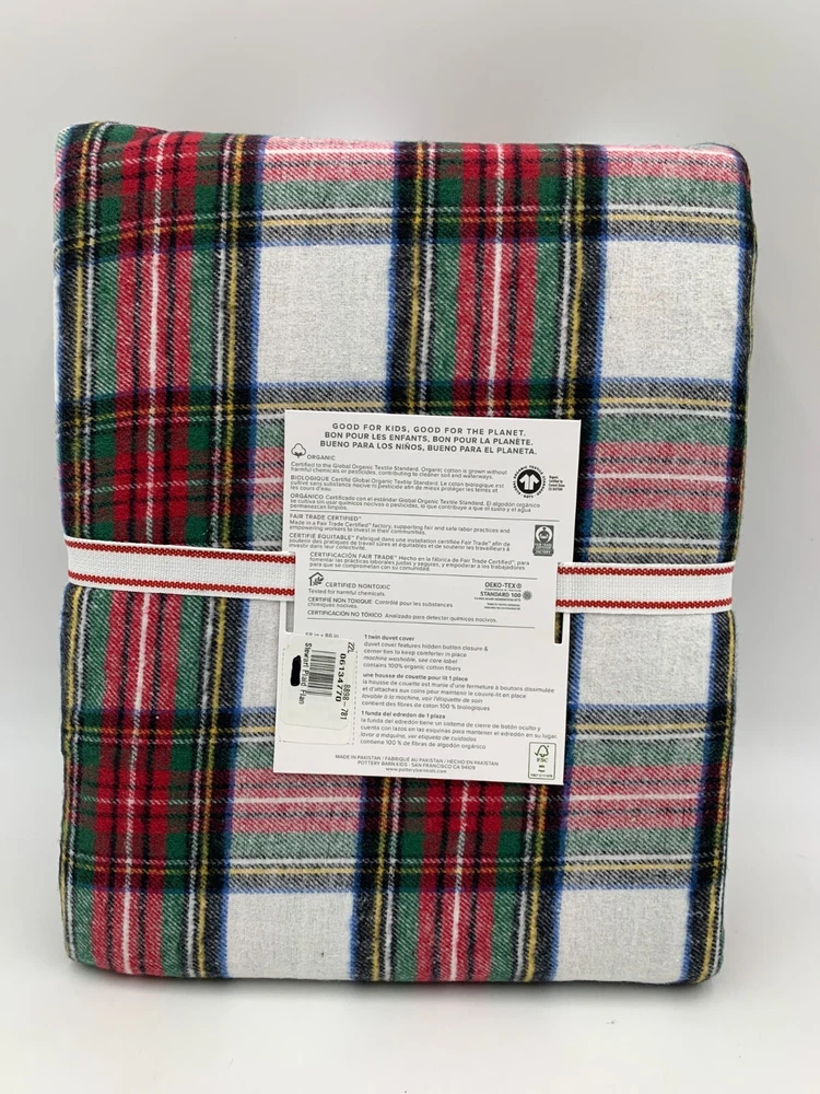 Pottery Barn Kids Flannel Stewart Plaid Twin Duvet Cover W/ 1 Std Sham #F60C Item is brand new! Auction includes: 1 kids twin duvet cover & 1 standard sham. DETAILS: Made of 100% cotton flannel. Duvet cover and shams reverse to same pattern. Duvet cover is finished with interior corner ties and a hidden button closure to keep the duvet in place. Shams have an envelope closure. Yarn-dyed – Fibers are treated individually with environmentally safe dyes before weaving to offer vibrant, lasting colors. Made in a Fair Trade Certified™ factory, supporting fair and safe labor practices and empowering workers to invest in their communities. Certified GOTS (Global Organic Textile Standards): This product meets the gold standard of textile production – it exceeds organic fiber requirements, contains no restricted chemicals and meets strict social responsibility standards. Pottery Barn Kids exclusive. Machine wash. Imported. DIMENSIONS Duvet Cover Twin: 68" wide x 86" long Full, Queen: 90" wide x 88" long Sham Standard Sham: 26" wide x 20" high CARE Wash bedding before first use. Machine wash in cold water; gentle cycle. Use only non-chlorine bleach, if needed. Tumble dry on low heat. Warm iron as needed.