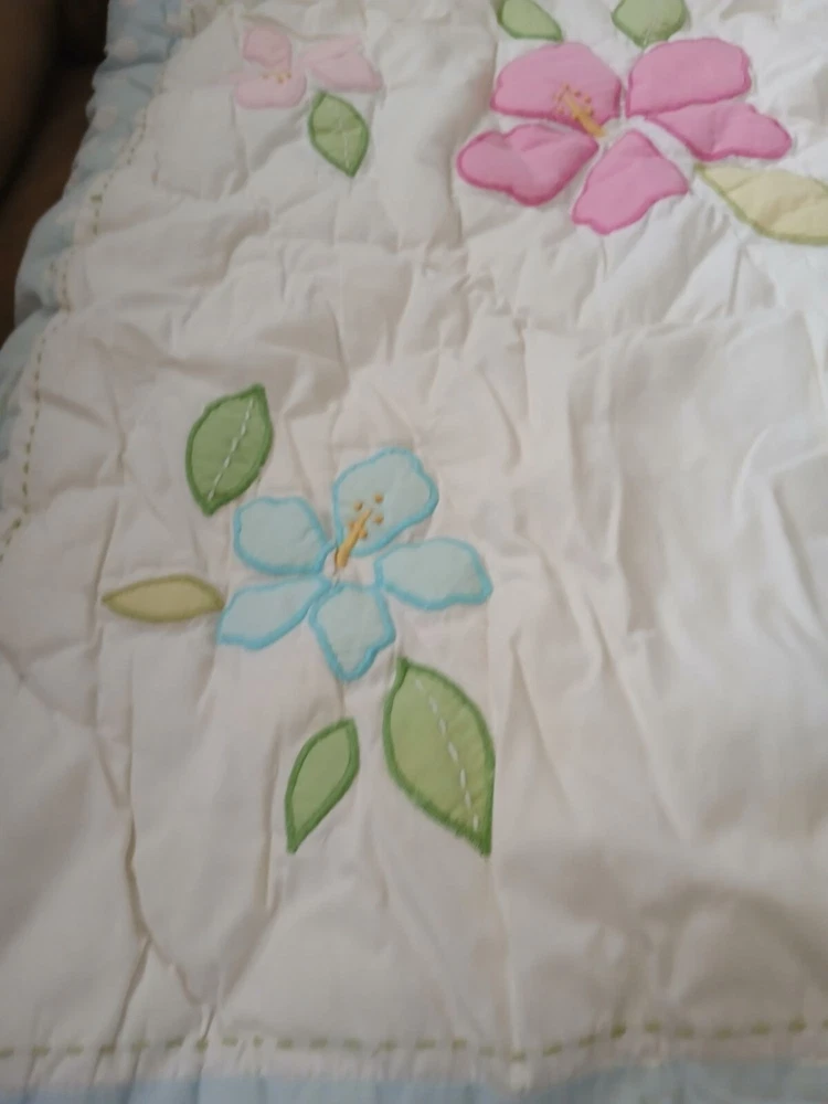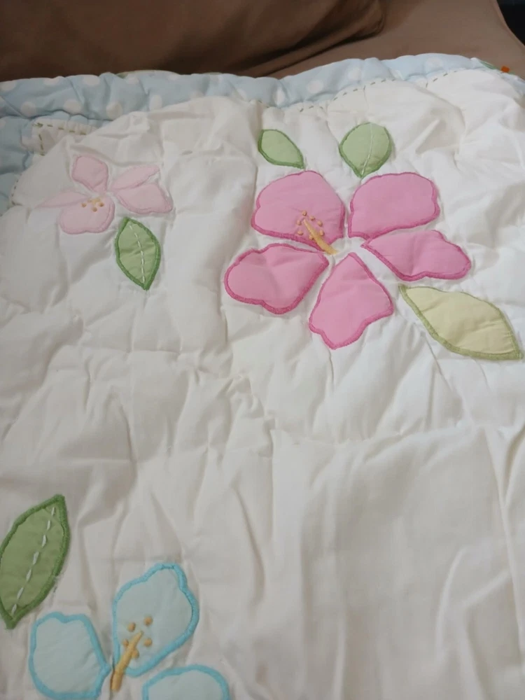 Add a touch of floral fun to your kid's space with this quilted standard pillow sham. It's reversible, so it's like getting two for the price of one. • Reversible design with plaid on one side • Quilted construction for added coziness • Features pink and blue floral appliqués • Machine washable