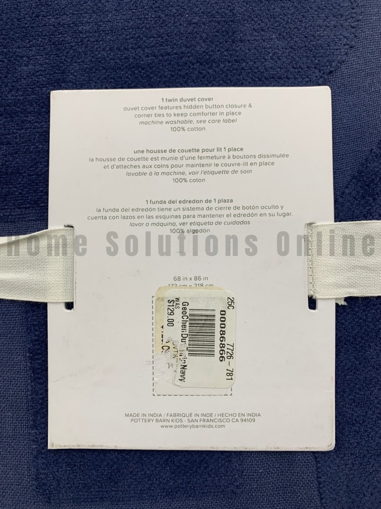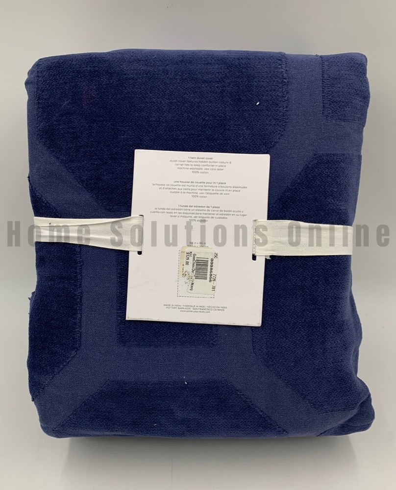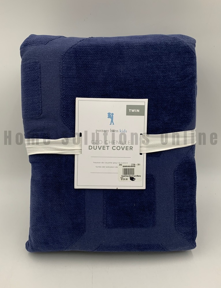 Pottery Barn Kids Geo Organic Chenille Duvet Cover Item is brand new Auction includes: 1 duvet cover DIMENSIONS: Duvet Cover Twin: 68" wide x 86" long Full/Queen : 90" wide x 88" long Shams Standard: 26" wide x 20" high CARE: Wash bedding before first use. Machine wash in cold water; gentle cycle. Use only non-chlorine bleach, if needed. Tumble dry on low heat. Warm iron as needed. Can be dry-cleaned.