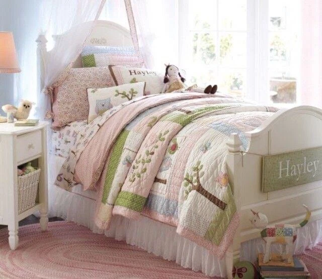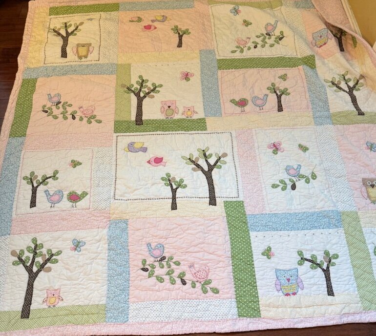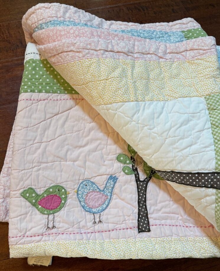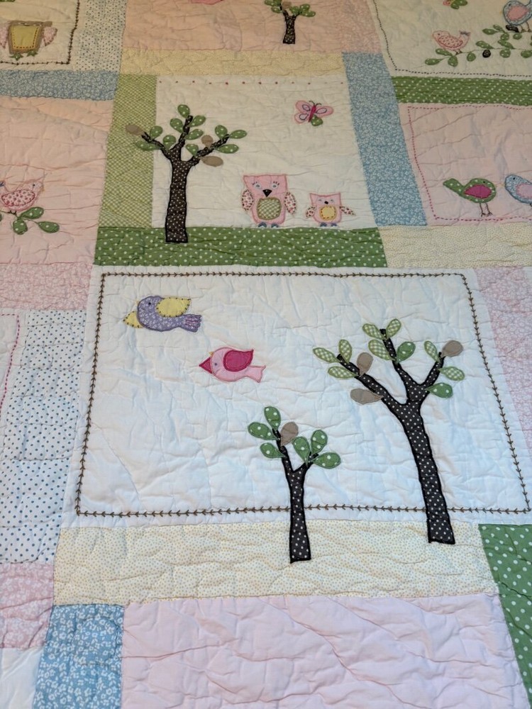 Pottery Barn Kids Sweet cotton quilt from Pottery Barn Kids! Hayley design with birds and owls. Pink, white, green, light blue, polka dots! Full/Queen size measuring 86 inches. Good gently used condition, I didn't find any stains or issues. I have added some stock photos to show what it looks like in a bedroom. This is for the quilt only. Items come from a petfree, nonsmoking home. See my other listings for more great items! If you have any questions, please ask before purchase. Returns are only accepted if I have made an error. Payment is expected within 2 days. Shipping/handling for this item is $20 to the United States, which includes delivery confirmation. No international shipping please. txzj pxzj12723 txzj-11 txzj74 txzj85 txzj115