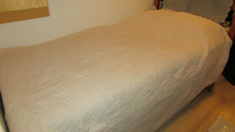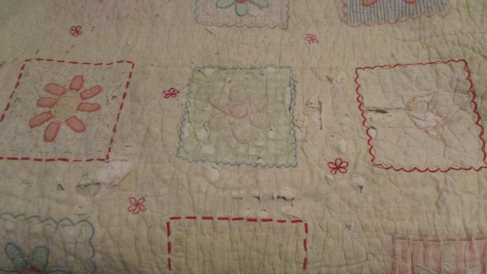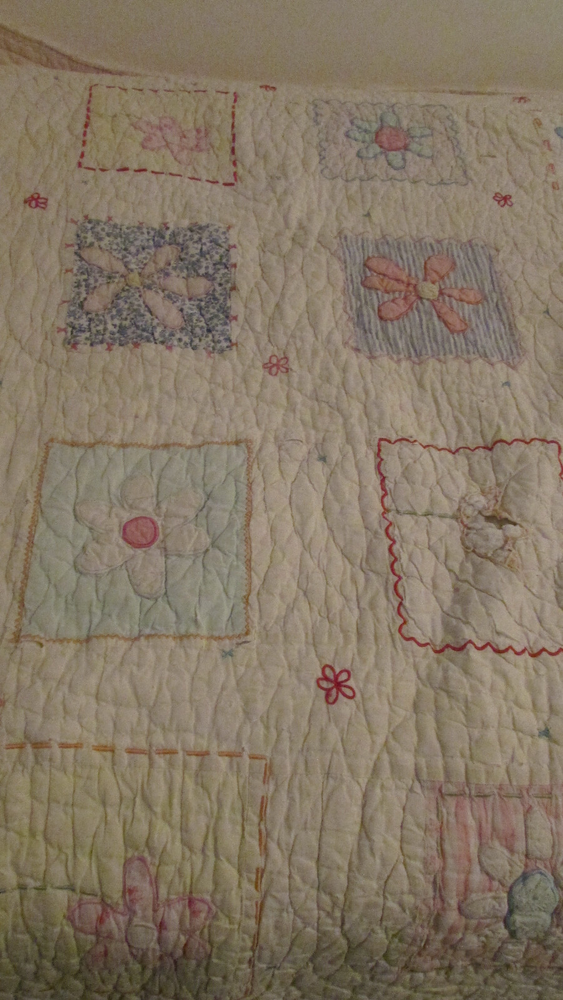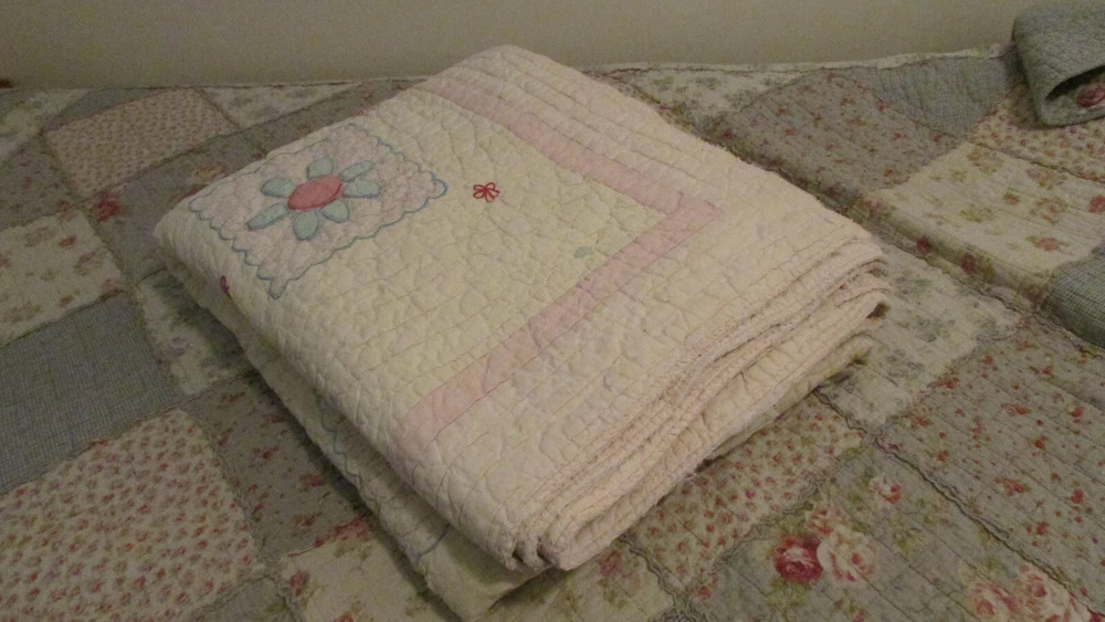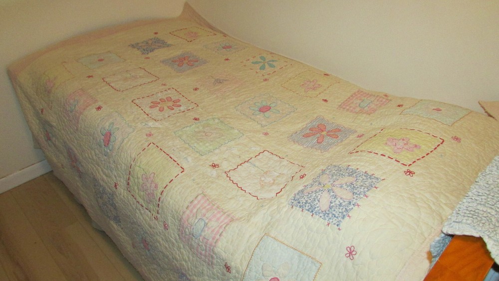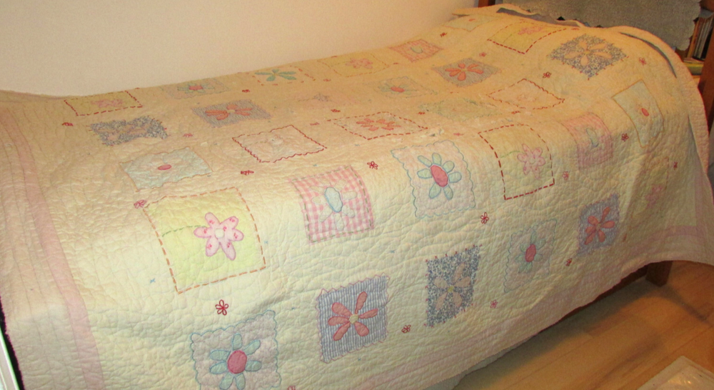 The Pottery Barn Kids Girls Twin Quilt in pink and yellow with a floral patchwork pattern is a charming addition to any girl's bedroom. This modern quilt features embroidered details and is machine washable. Made in India, this quilt is designed in a fun and curious garden theme, perfect for kids who love a touch of whimsy in their room. With its rectangle shape and twin size, this quilt adds a touch of style and comfort to any bedroom setting. Note :Please see pictures closely! This is a well worn quilt!