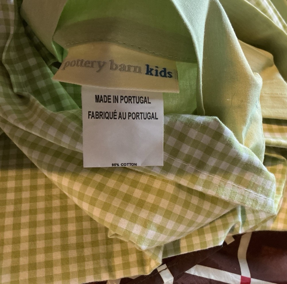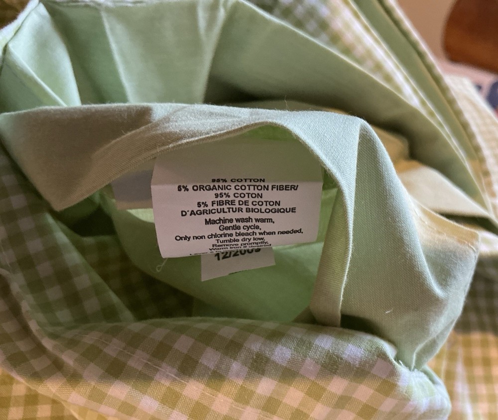 This twin duvet cover is new and unwashed, 86x68in. Cotton gingham plaid with button closure. Does not include sham or pillowcase. Light green gingham on one side and solid green chambray on the other...