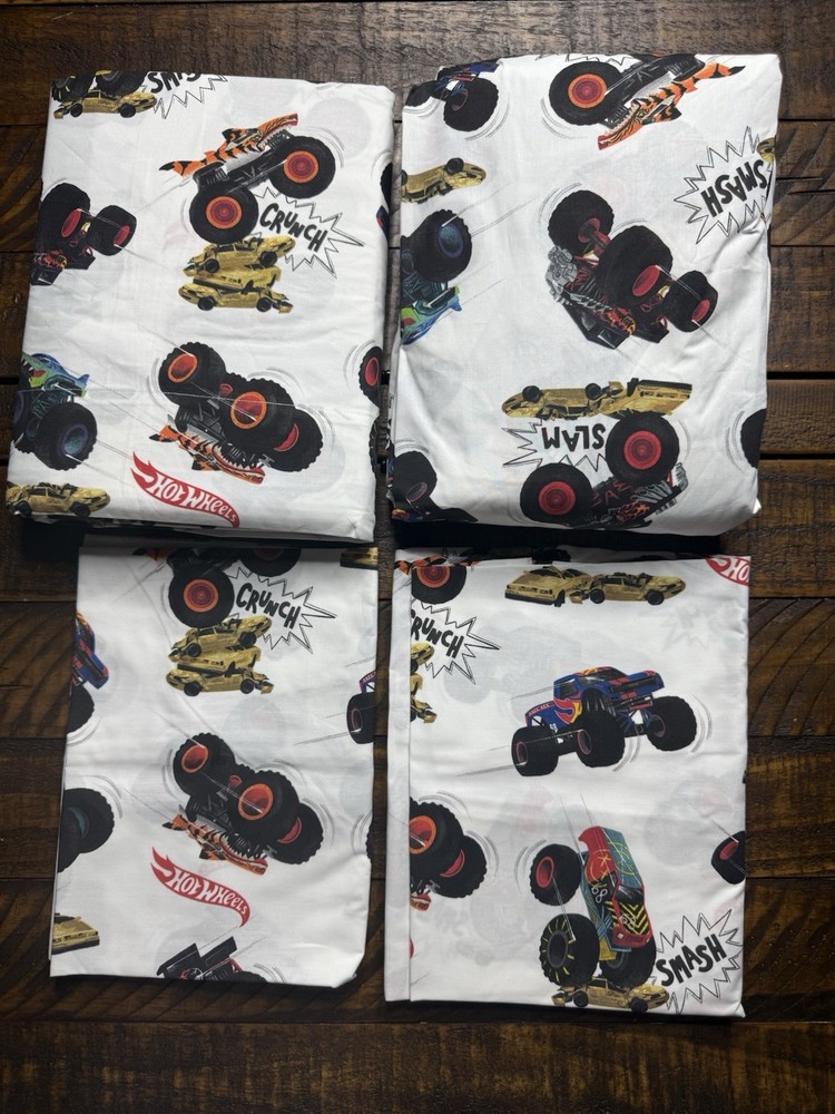 The Pottery Barn Kids Hot Wheels Monster Trucks Organic 4 Piece Sheet Set in Queen size is a stylish and fun addition to any child's bedroom. Made from 100% cotton with a pictorial design featuring monster trucks, this white sheet set is machine washable and features contemporary design elements. Perfect for young Hot Wheels fans, this set includes a pillowcase and is labeled with Öko-Tex Standard certification for quality assurance. With its high-quality materials and unique design, this sheet set is both practical and playful for a child's room.