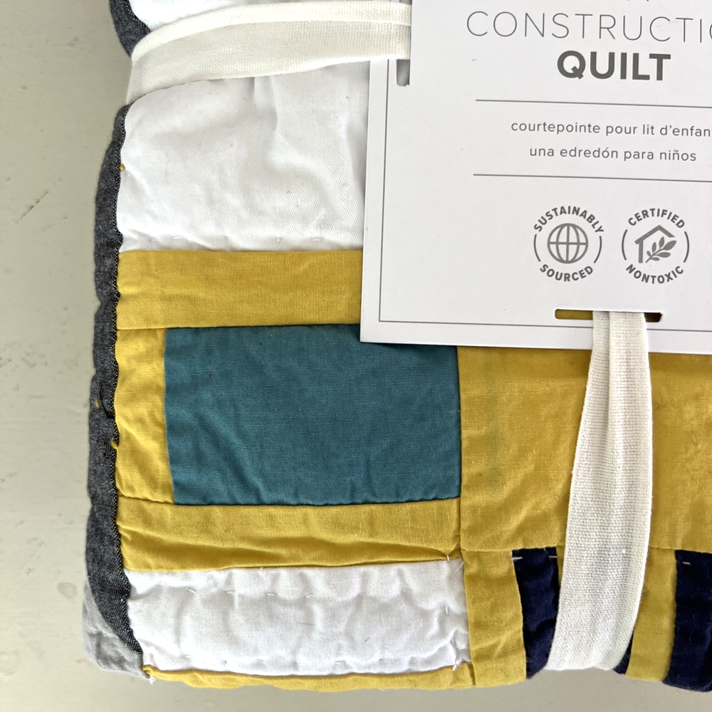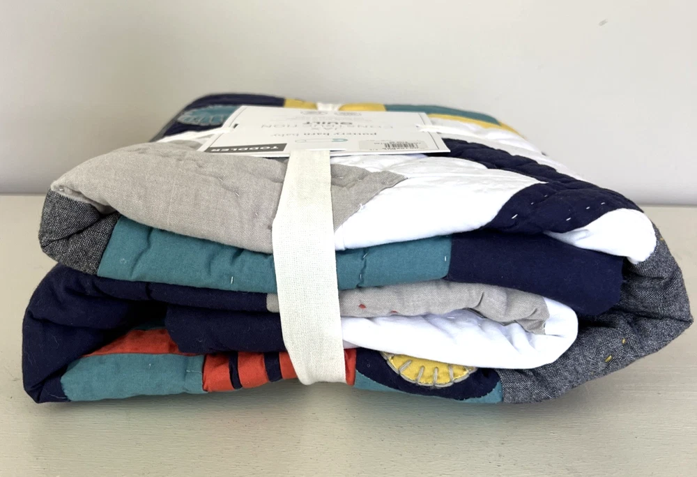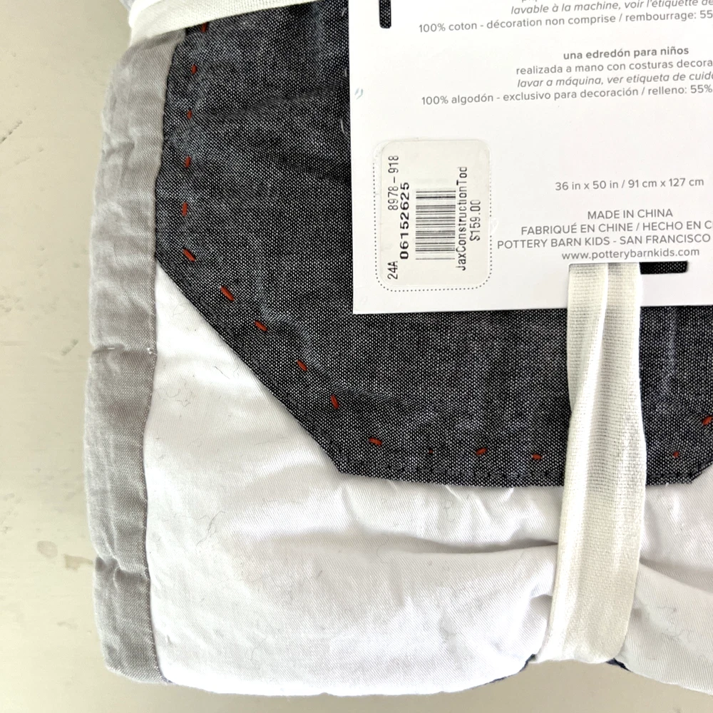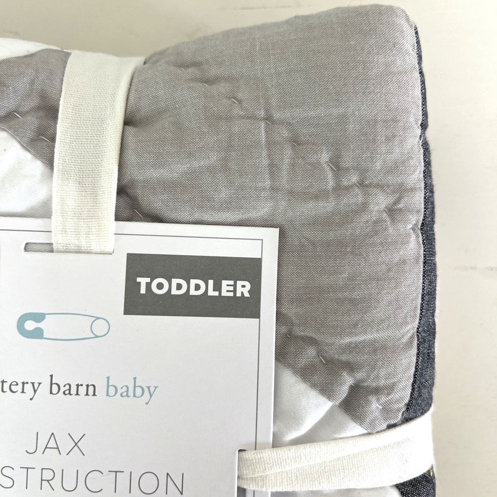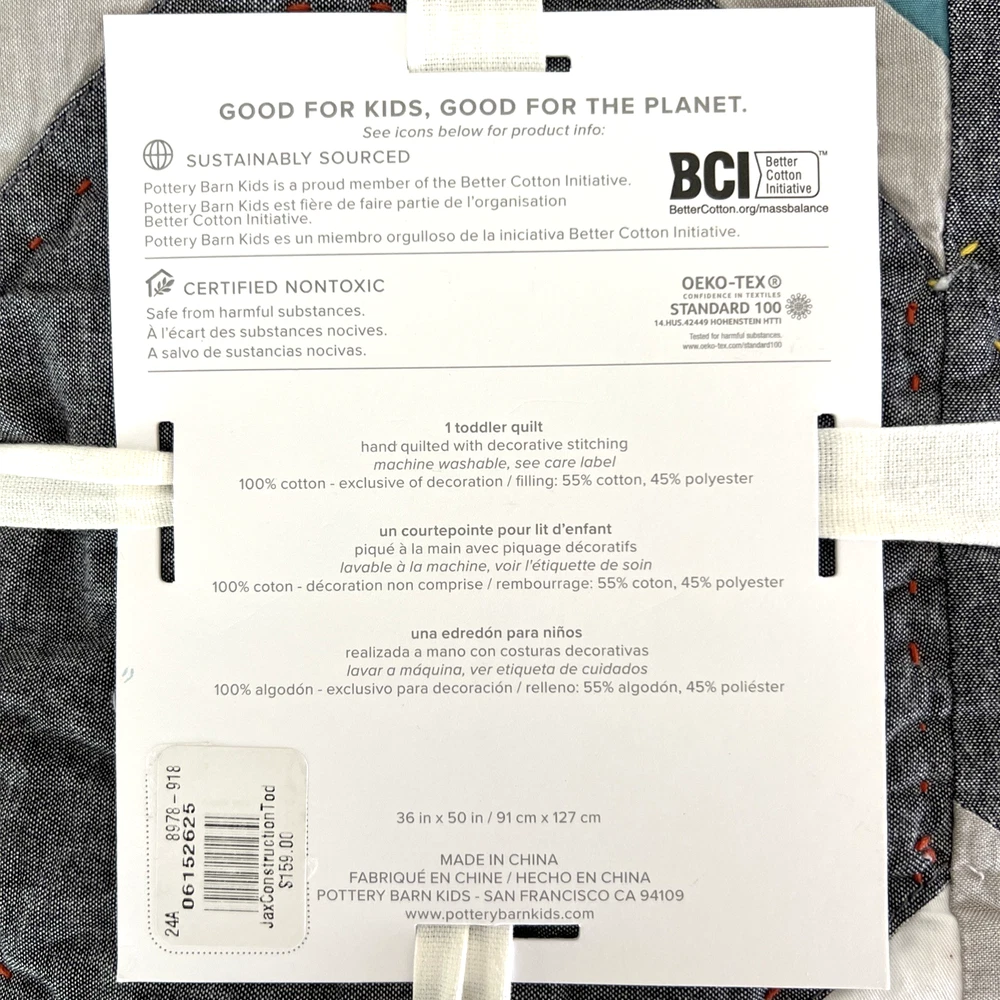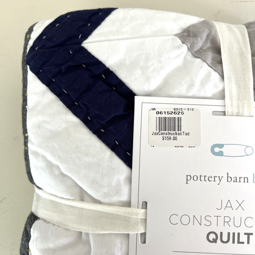 The Pottery Barn Kids Jax Construction Cotton Baby/Toddler Quilt is a charming and colorful quilt featuring a construction equipment theme, perfect for little ones who love trucks and excavators. Made from cozy cotton material, this 36" x 50" quilt is designed to fit a toddler bed and is personalized with the iconic Pottery Barn Kids brand. The multicolor design adds vibrant and playful touches to any nursery bedding collection, making it a delightful addition to any child's room. Please refer to all photos for additional details.