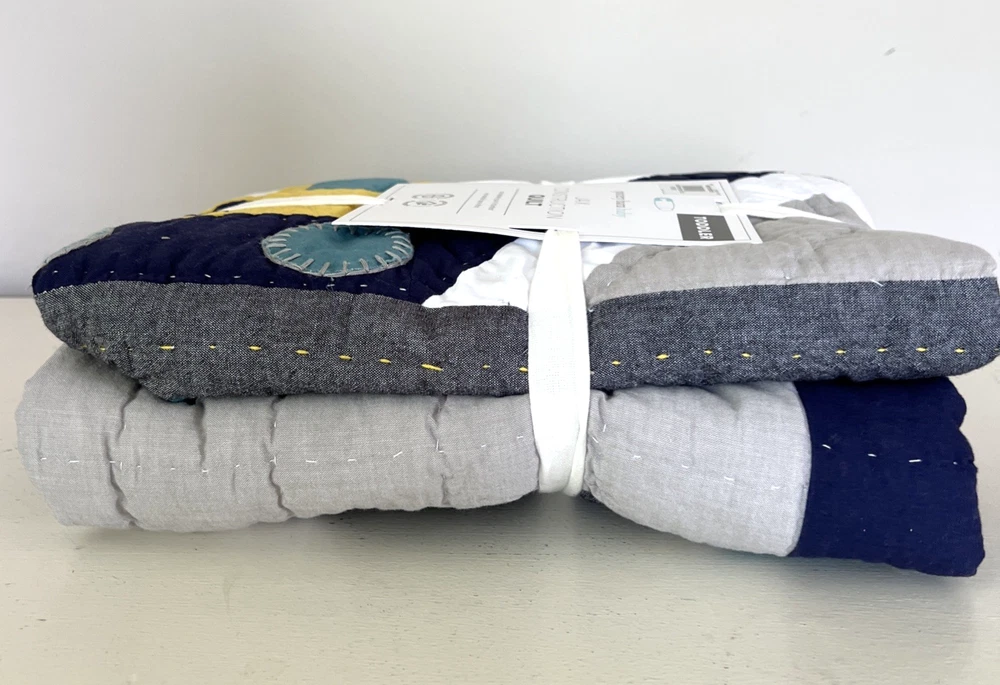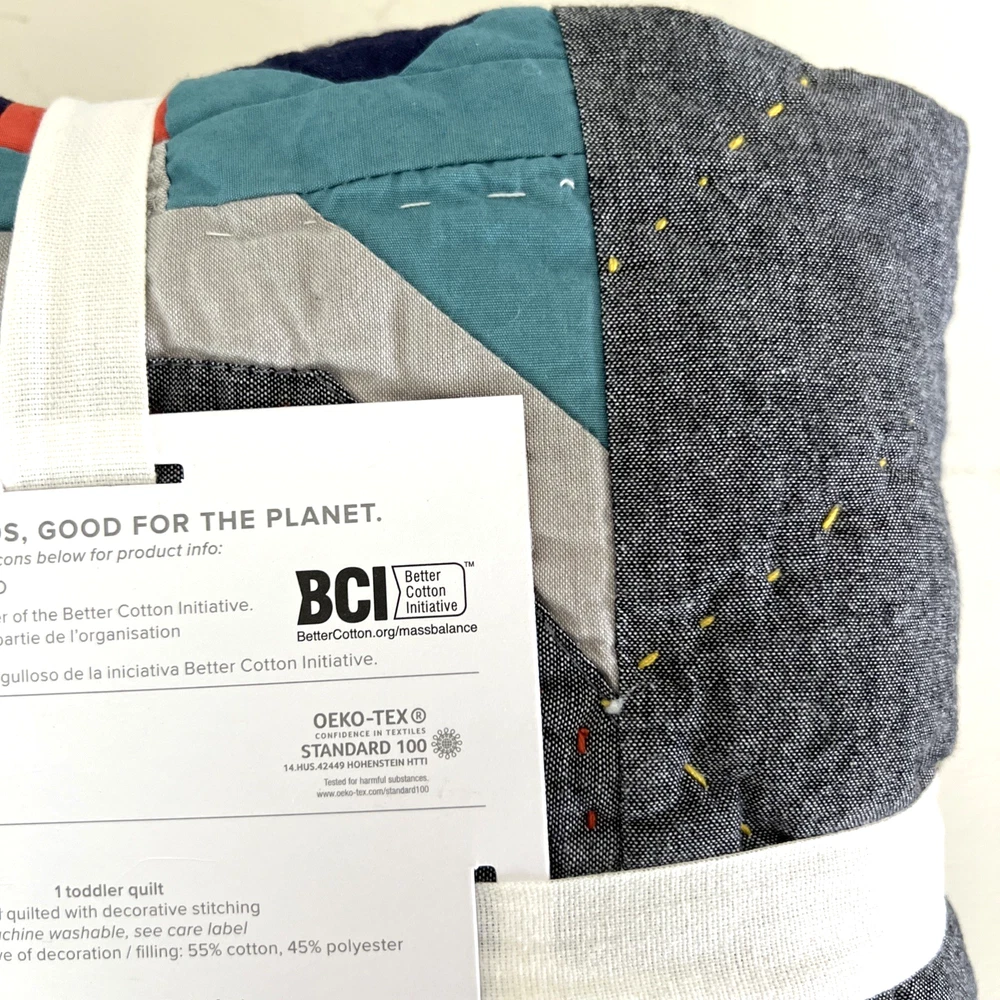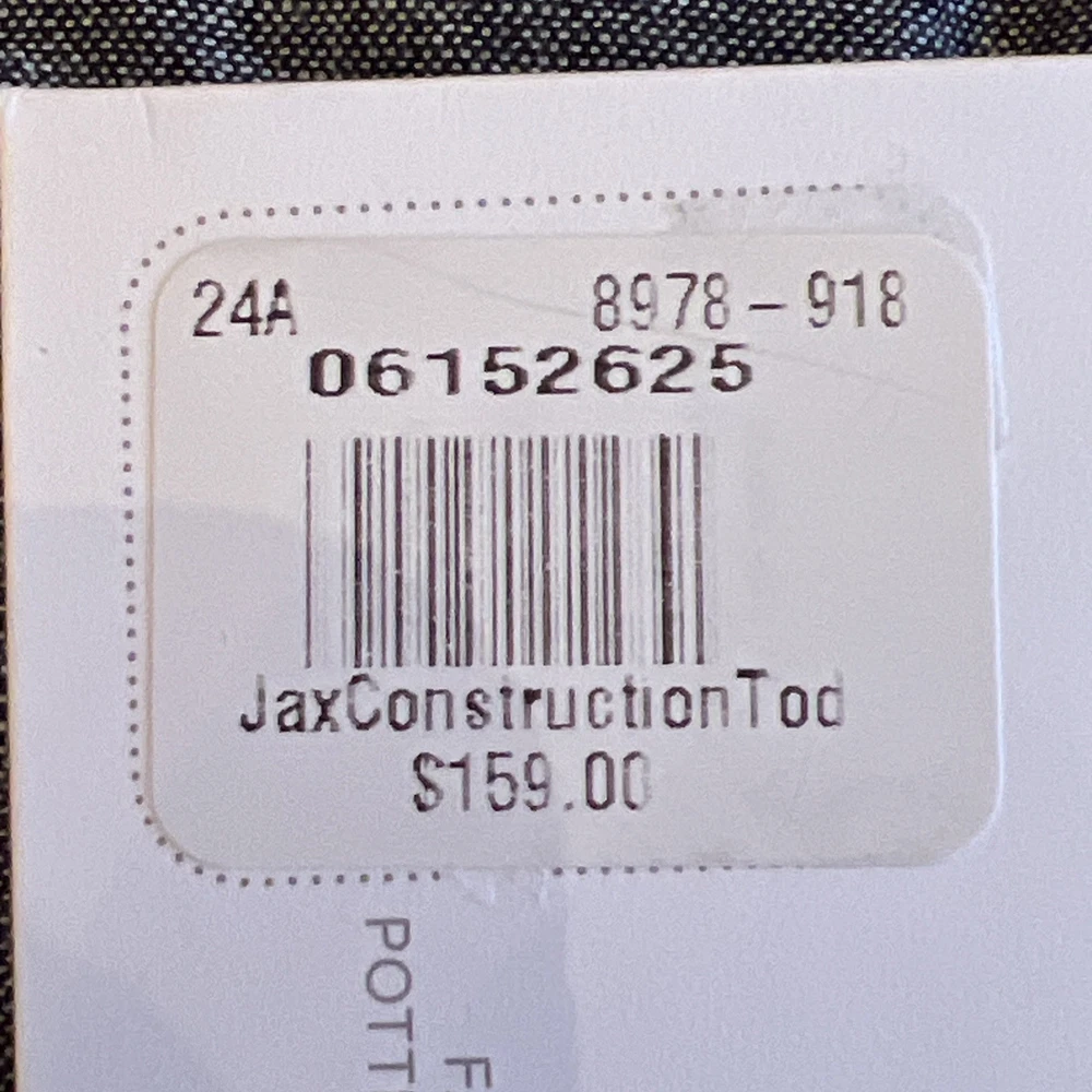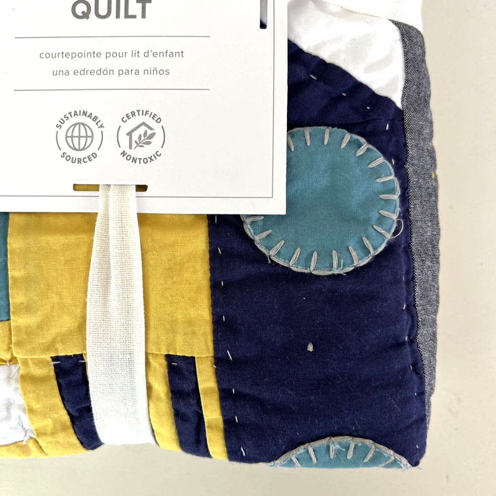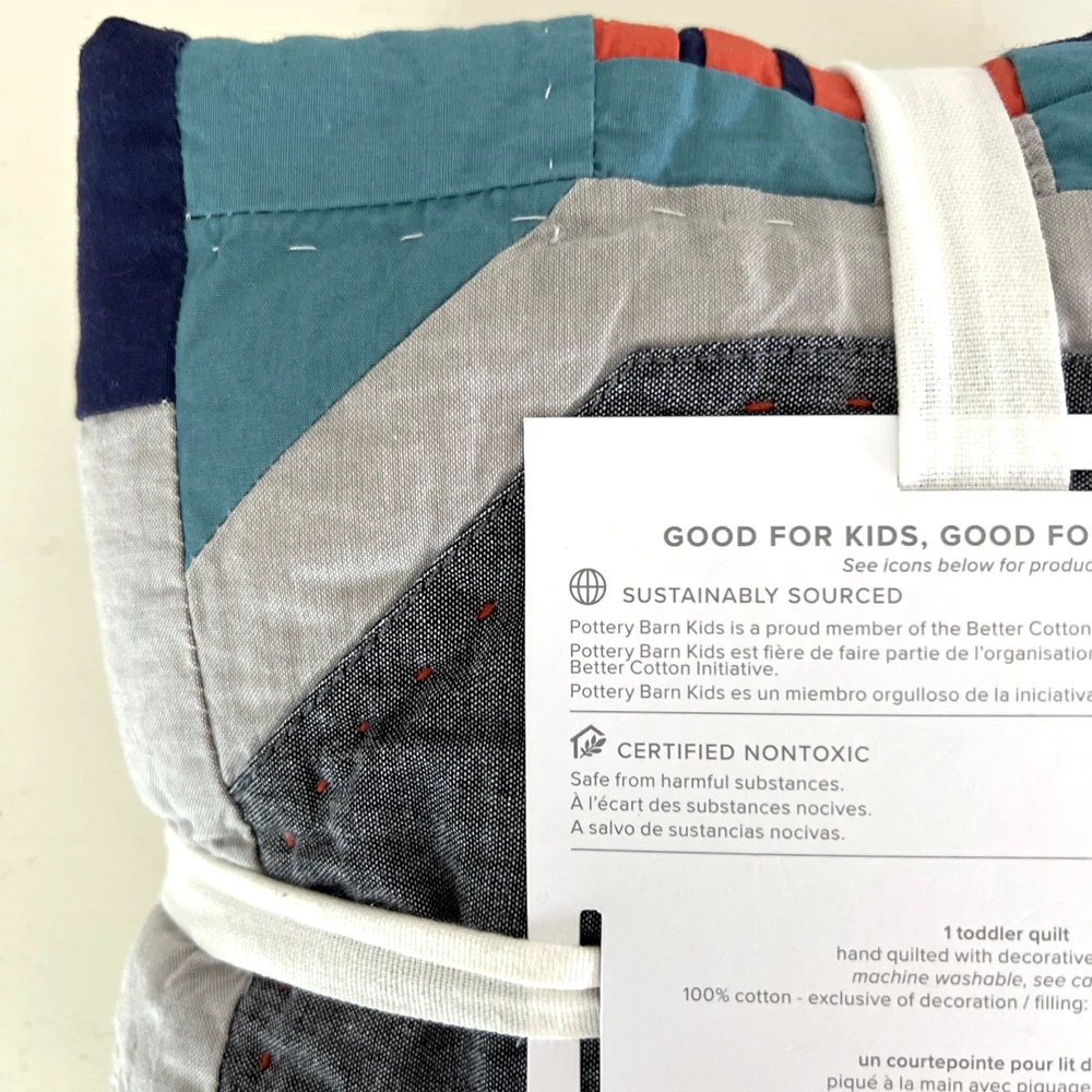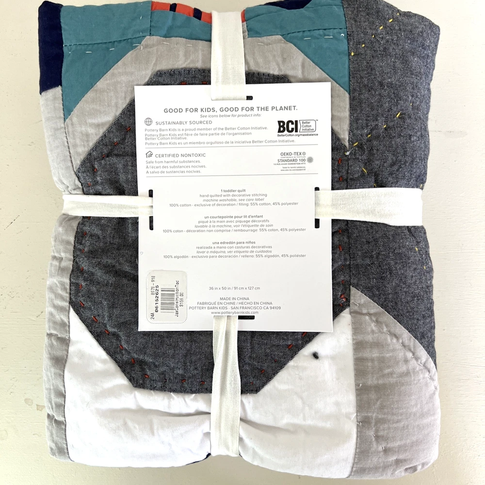 The Pottery Barn Kids Jax Construction Cotton Baby/Toddler Quilt is a charming and colorful quilt featuring a construction equipment theme, perfect for little ones who love trucks and excavators. Made from cozy cotton material, this 36" x 50" quilt is designed to fit a toddler bed and is personalized with the iconic Pottery Barn Kids brand. The multicolor design adds vibrant and playful touches to any nursery bedding collection, making it a delightful addition to any child's room. Please refer to all photos for additional details.