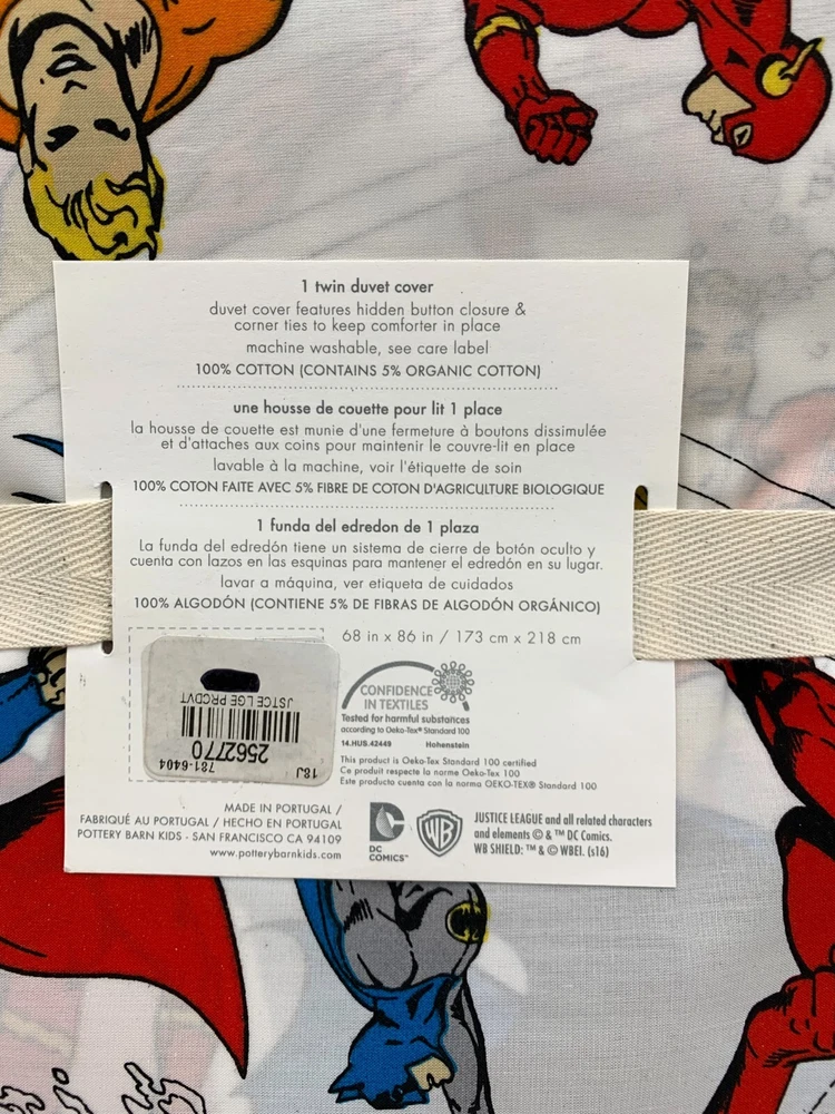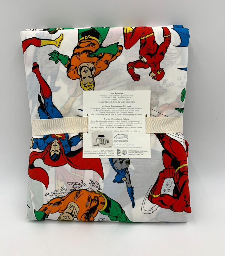 Pottery Barn Kids Justice League Duvet Cover Twin White Multi #7405J Item is brand new! Auction includes: 1 kid's twin duvet cover. DETAILS: Pattern of DC Justice League characters. 100% cotton; contains 5% organic cotton. Hidden button closure & corner ties to keep comforter in place. DIMENSIONS: Twin: 68"W x 86"L CARE: Machine washable.