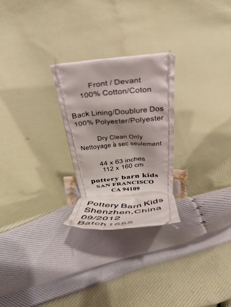 Used curtains. As with any used fabric items, there may be some minor wear that the not visible unless you look up close, and which will likely cleanout with dry cleaning. Set of 2. Used for 2 years in a baby nursery. Definitely worth it with the blackout feature. These are nice and heavy! Final sale. No returns. Add a touch of elegance to your kid's bedroom with these Pottery Barn gingham drapery panels. The light green twill fabric with a blackout liner ensures privacy and a peaceful ambiance. Measuring 44x84 inches, these curtain panels are made of high-quality cotton material, making them lightweight and durable. Perfect for your little one's room, these panels come in a set of 2, and their unique pattern adds a stylish touch to any decor. Get these Pottery Barn Kids curtain panels today and let your child enjoy a cozy and serene atmospher