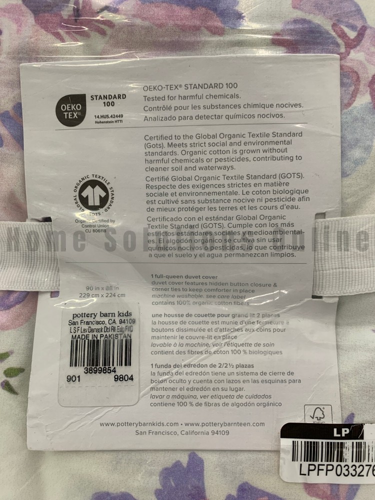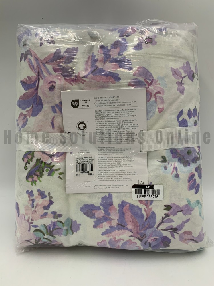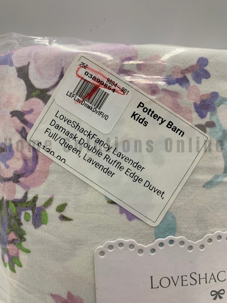 Pottery Barn Kids Love Shack Fancy Damask Ruffle Duvet Item is brand new Auction includes: 1 duvet cover DIMENSIONS: Duvet Cover Twin: 68" wide x 86" long Full/Queen: 90" wide x 88" long Sham Overall: 26" wide x 20" high CARE: Wash bedding before first use. Machine wash per vendor directions; gentle cycle. Use only non-chlorine bleach, if needed. Tumble dry on low heat. Warm iron as needed. DETAILS THAT MATTER: Made of 100% organic cotton percale. Features a digitally printed design on front and back. Features 2.5" and 3" double ruffed edge gathered around border. Percale weave is a tightly woven weave, which gives the fabric a soft matte finish while providing durability and wears well over time. Duvet cover is finished with interior corner ties and a hidden button closure to keep the duvet in place. Hypoallergenic to protect against allergens and create a healthy sleep environment. OEKO-TEX® STANDARD 100: tested for 1000+ harmful substances to keep you and your family safe. 21.HUS.86232 HOHENSTEIN HTTI. KEY PRODUCT POINTS: Pottery Barn Kids exclusive. Duvet cover, shams and inserts are sold separately. Sham has envelope closure. Duvet cover and sham reverse to same pattern. Machine wash. Imported.