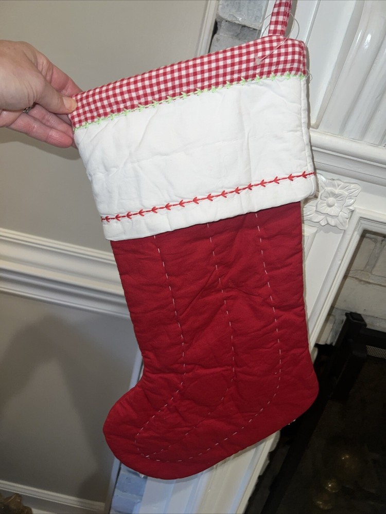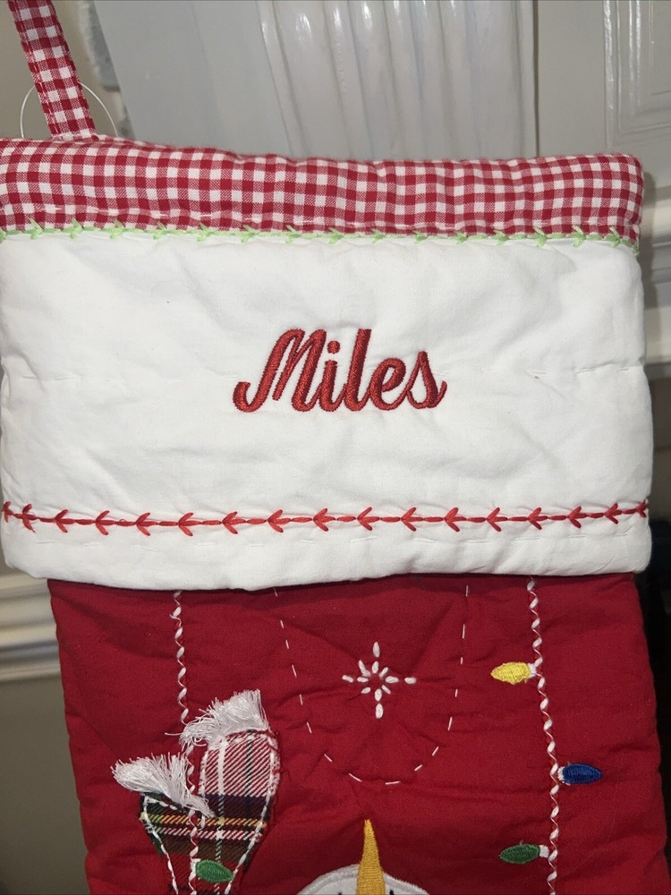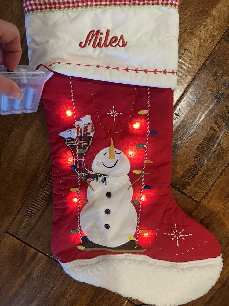 Pottery Barn Kids Christmas stocking Red quilted with a gingham accent. Miles is monogrammed in red. This stocking has a place for 3 AA batteries- not included. I did get it to light up, but I had to hold the on switch over to make it light up. Therefore, I am selling as parts because I cannot guarantee that it will stay lit. Otherwise, it’s a perfect normal stocking. New without tags