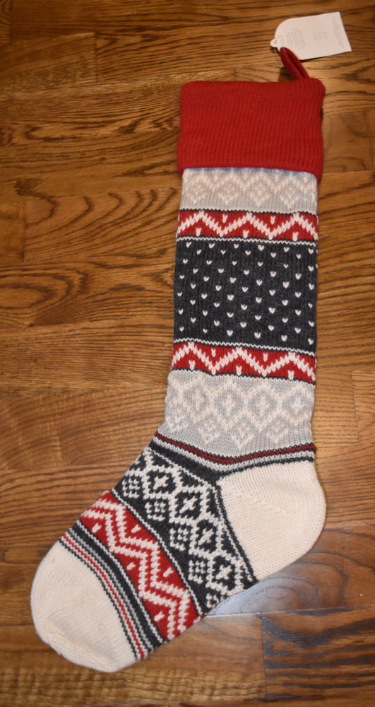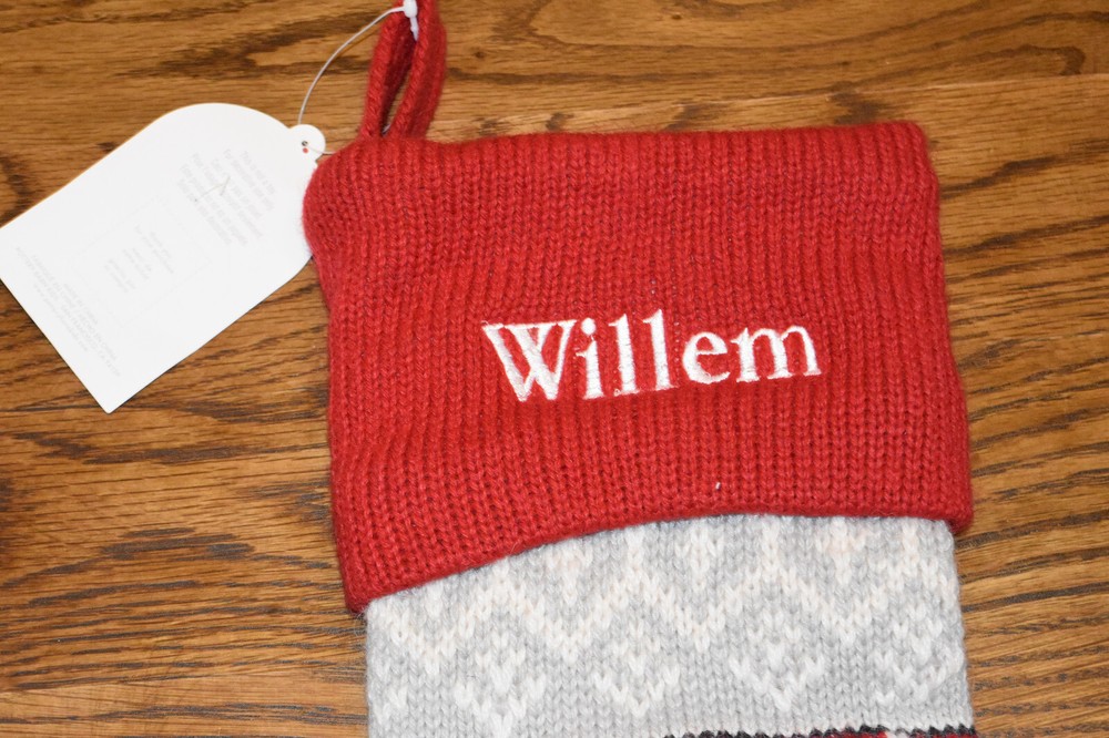 Has Willem embroidered with white thread. DIMENSIONS Overall: 11" wide x 27" long Cuff: 4.5" high Length from top of cuff to heel: 21" long Length from heel to toe: 11" long Hanging Loop: 3" long Weight: 0.5 lbs CARE Spot clean with soft damp cloth. Blot to remove excess water. Air dry. DETAILS THAT MATTER Vivid and intricate 3-D details, appliques and embroidery. Made from 55% wool and 45% polyester. Stocking is lined with 74% polyester and 26% cotton. Stocking is yarn-dyed – fibers are treated individually with environmentally safe dyes before weaving to offer vibrant, lasting colors.