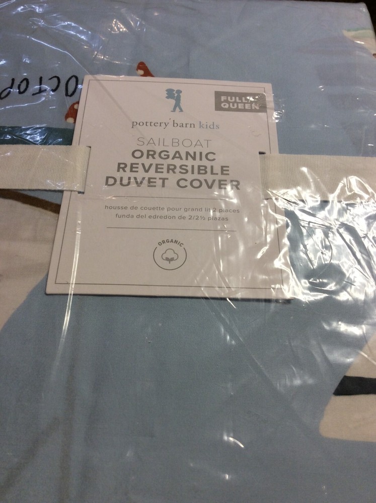 One Full/Queen Duvet Cover by Pottery Barn Kids in the Organic reversible Sailboat Bedding Collection Cast off for sweet dreams! This fleet of sailboats, schooners, yachts and cruise ships—accented by an adorable octopus—is printed on super-soft organic cotton for cozy comfort, and the pieces reverse from blue to white for two looks in one. Duvet cover is made of 100% organic cotton percale. Digitally printed design. Duvet cover is finished with interior corner ties and a hidden button closure to keep the duvet in place. New with Tags Pet Free/Smoke Free
