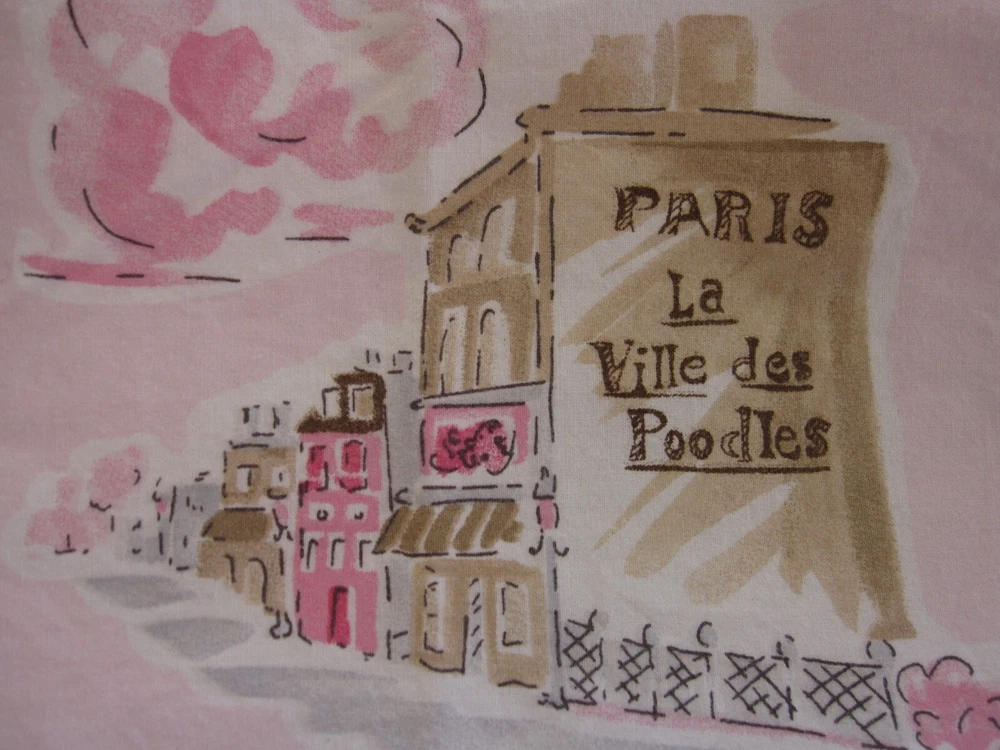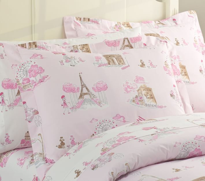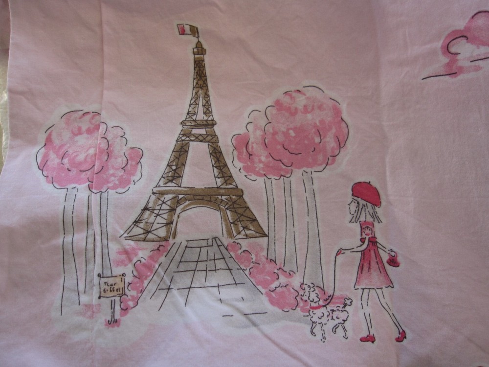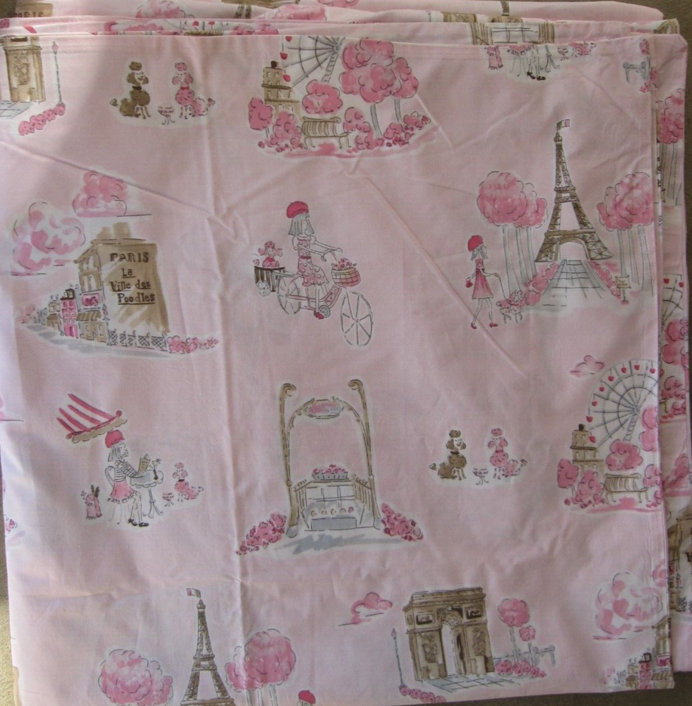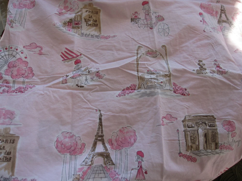 "Paris Toile" duvet set from Pottery Barn Kids features a whimsical print with poodles, Parisians and the Eiffel Tower. Set includes one full/queen duvet cover plus two standard shams and one standard pillowcase. 100% cotton. Excellent condition. No longer available from PBK. Smoke free, pet free MADE IN ISRAEL