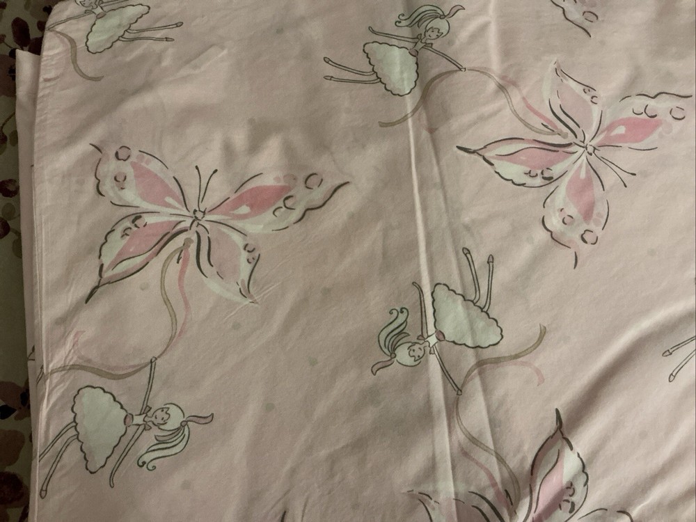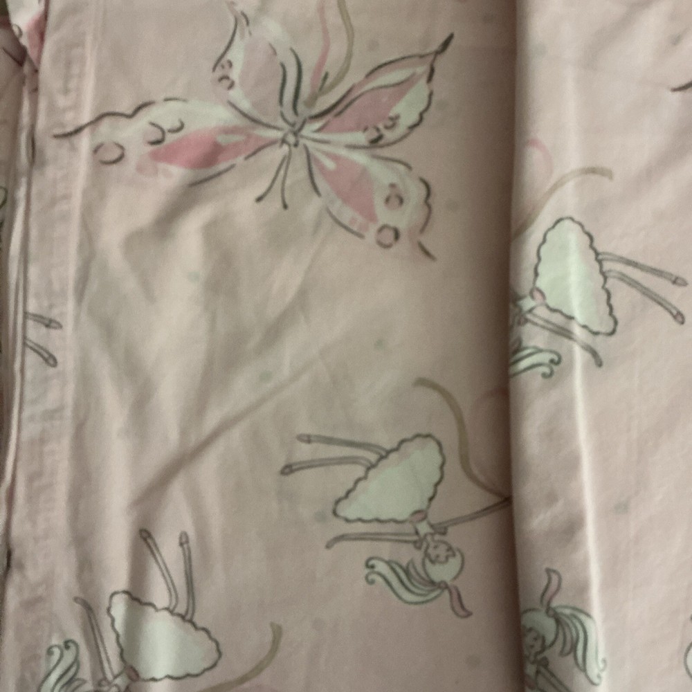 This Pottery Barn Kids Pink Butterfly and fairies Queen Duvet Cover features a modern design with a theme making it perfect for a kids' bedroom. The rectangular duvet cover is adorned with a pattern of butterflies and is made of 100% cotton for softness and comfort. It includes buttons for closure and is machine washable for easy care. This Pottery Barn brand duvet cover does not have personalization options and is part of a set that includes only the duvet cover.