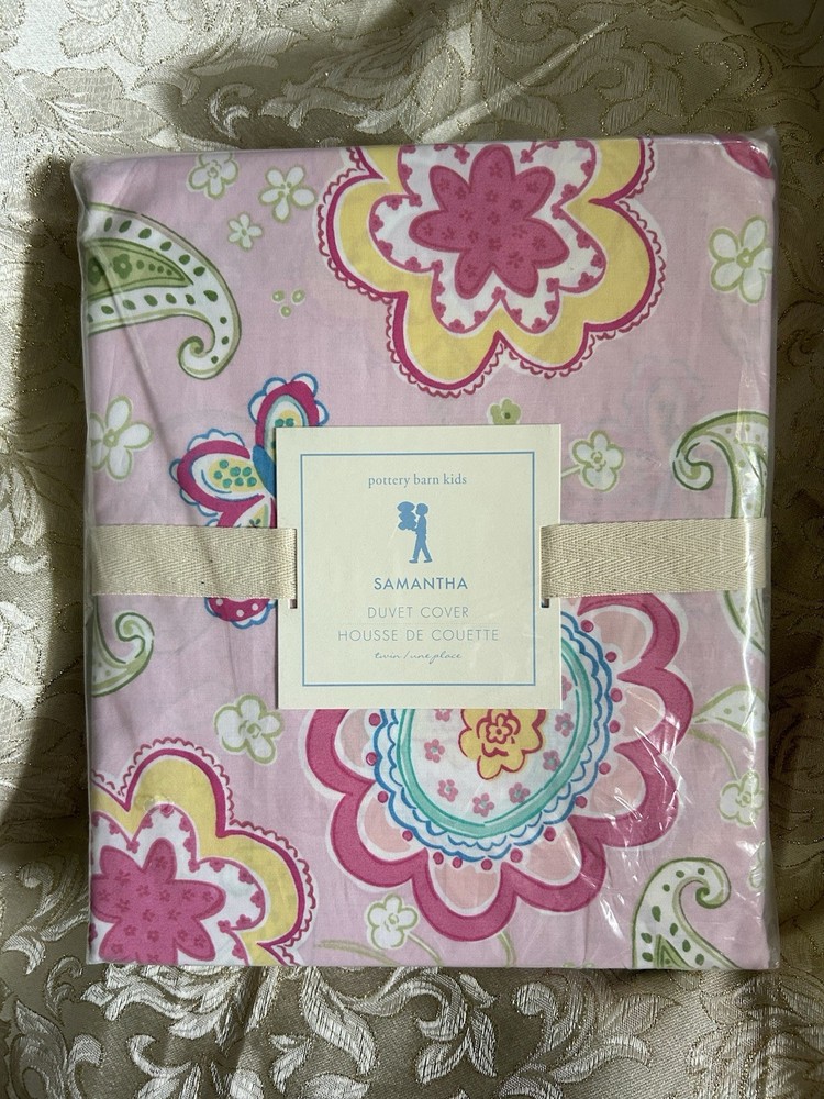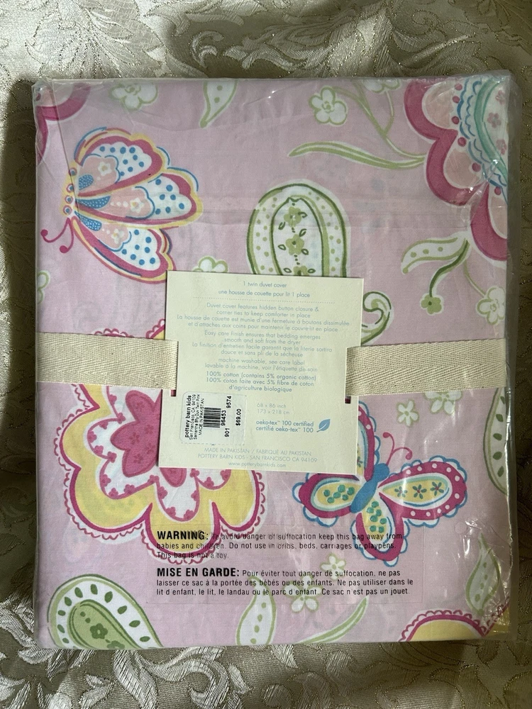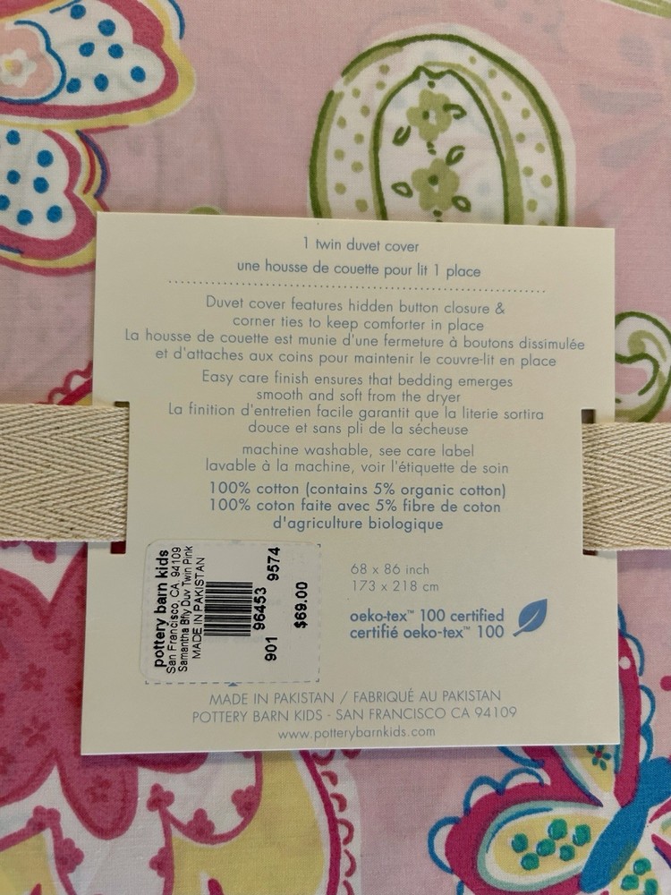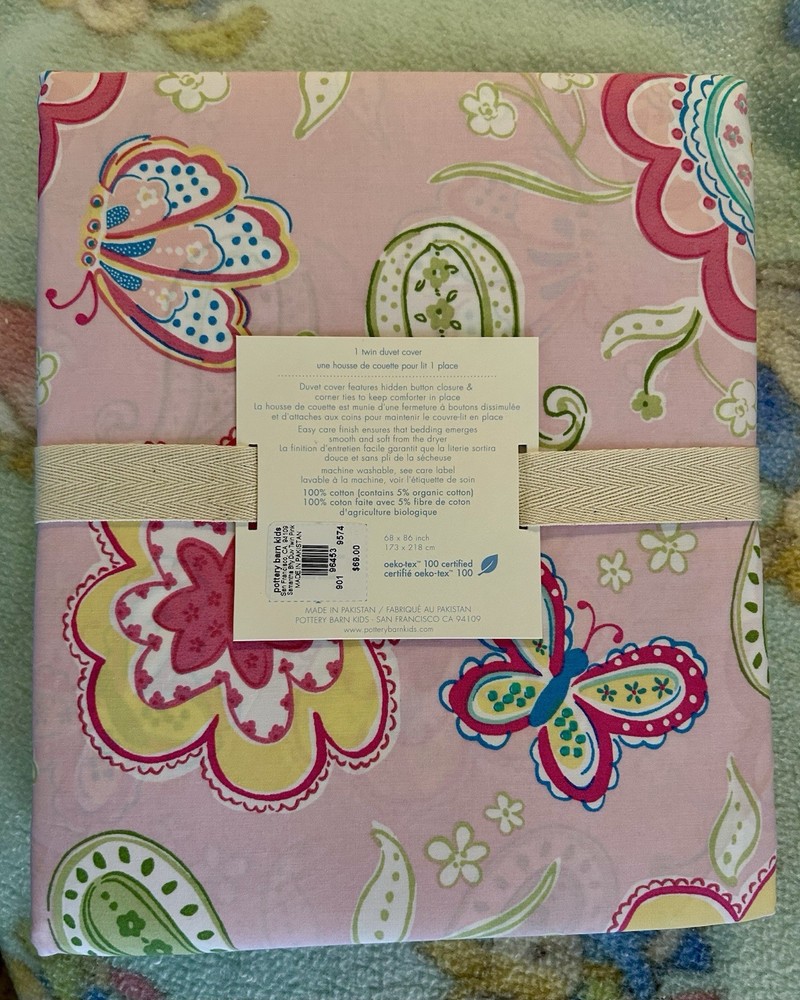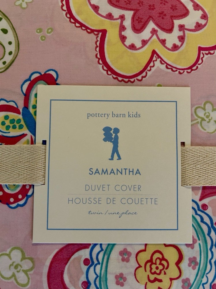 NEW in original packaging. The Pottery Barn Kids Pink Butterfly Floral Samantha Twin Duvet Cover is a charming addition to any child's bedroom. Made of 100% cotton, this duvet cover features the Samantha pattern in vibrant multi-colors. The main background color is a beautiful pink with colorful flowers and butterflies. With a closure type of buttons, it is easy to put on and take off, making it convenient for both parents and kids. This machine washable duvet cover from Pottery Barn Kids is designed specifically for a twin bed / day bed. Perfect for creating a cozy and stylish sleep space for your little one. This duvet cover is NEW in the package. (No shams - they are sold separately) Retails for $69.00