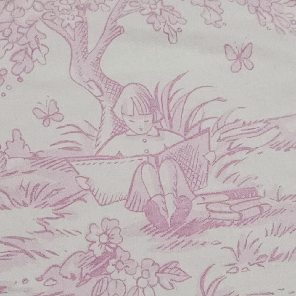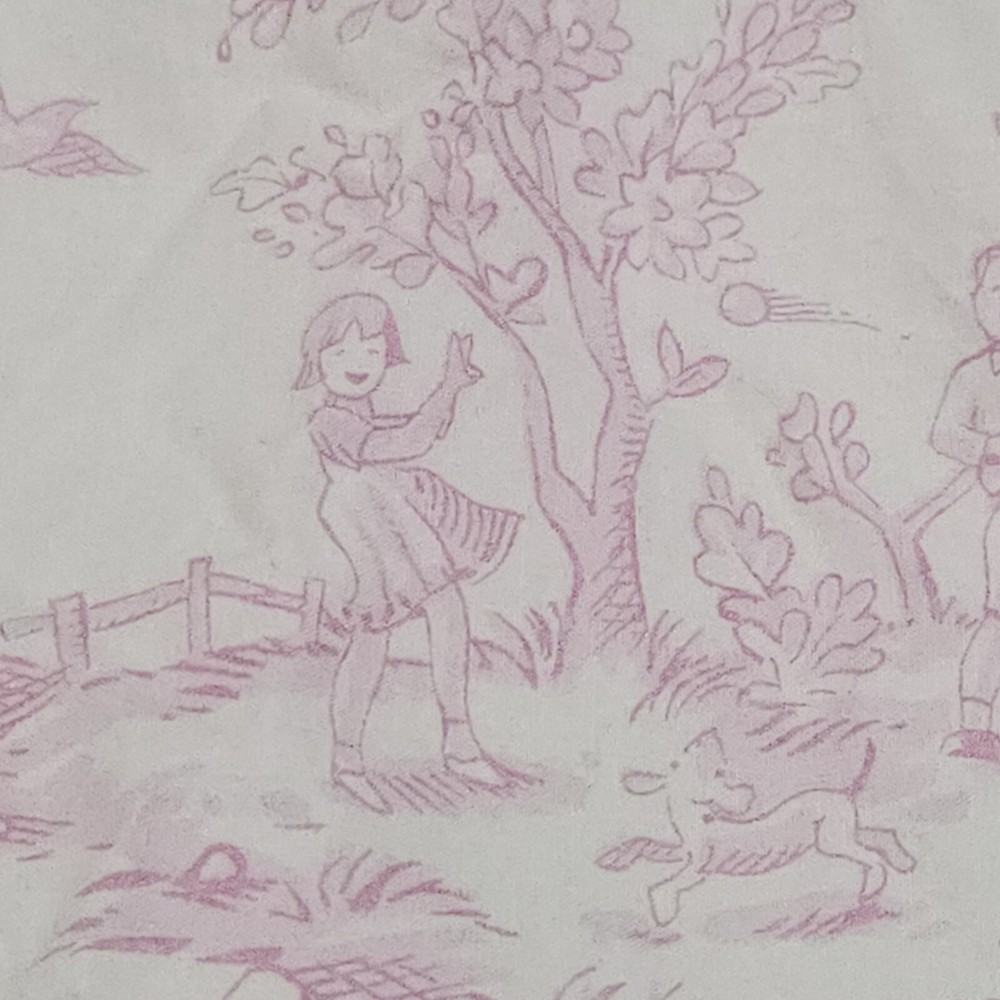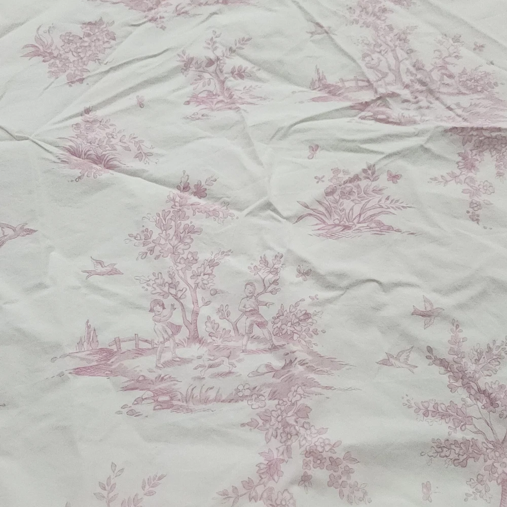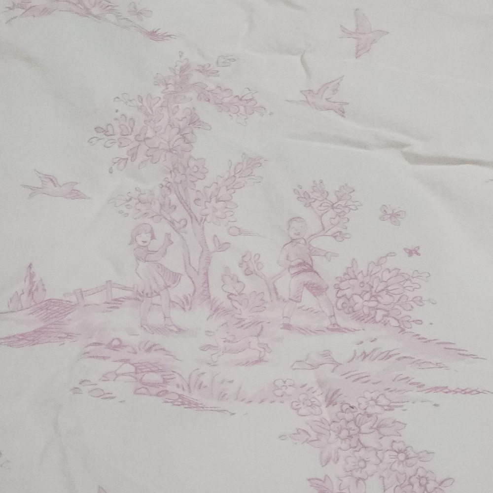 Pottery Barn Kids Pink Isabelle Floral Cotton Twin Bed Duvet Cover Toile pattern with Children playing outside under Trees . Double sided slightly different in colors on each side. background is pink on one side white on the other with the same print of children, button closure at the bottom, seems to have been used gently no problems seen with it, from 2008 per the tag.
