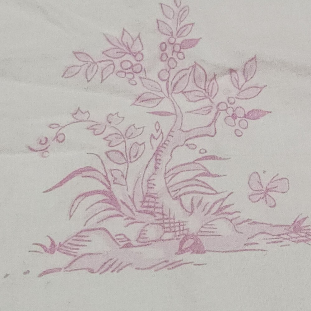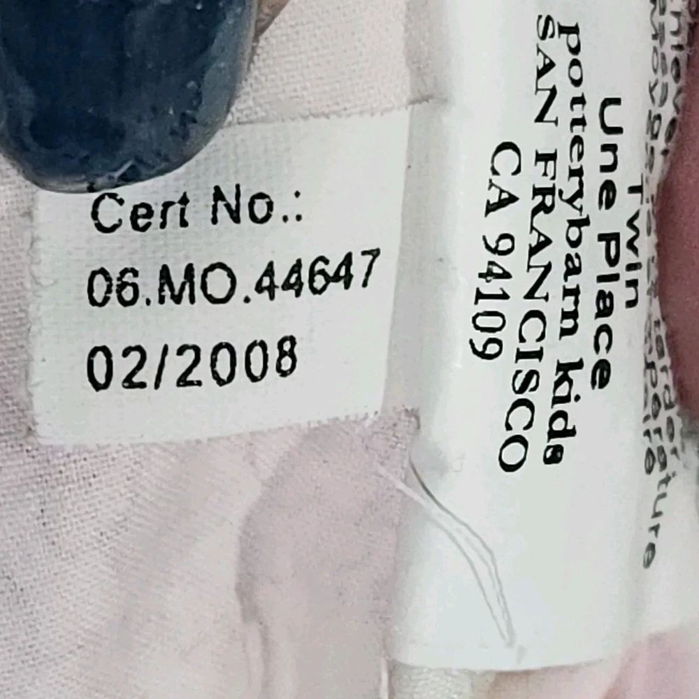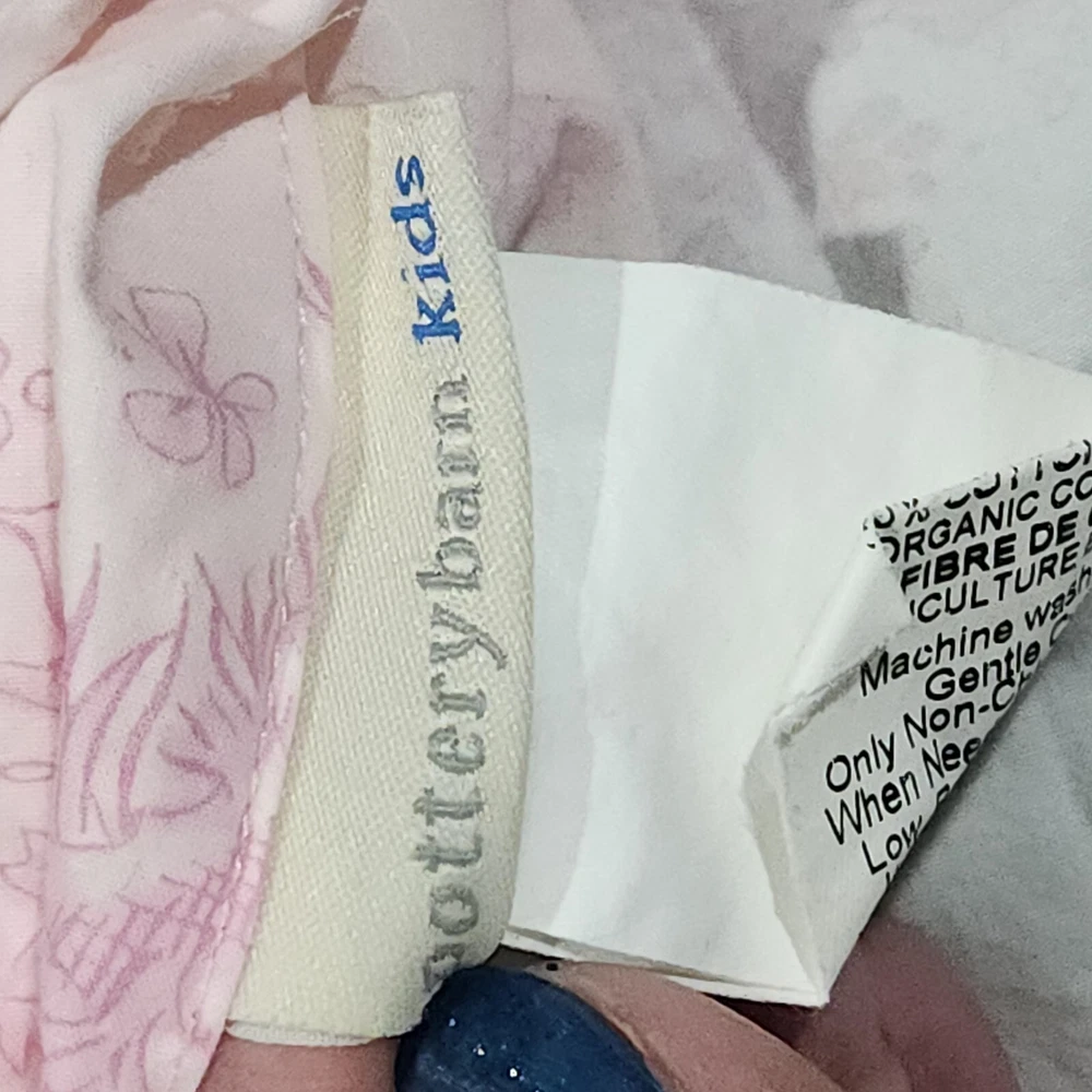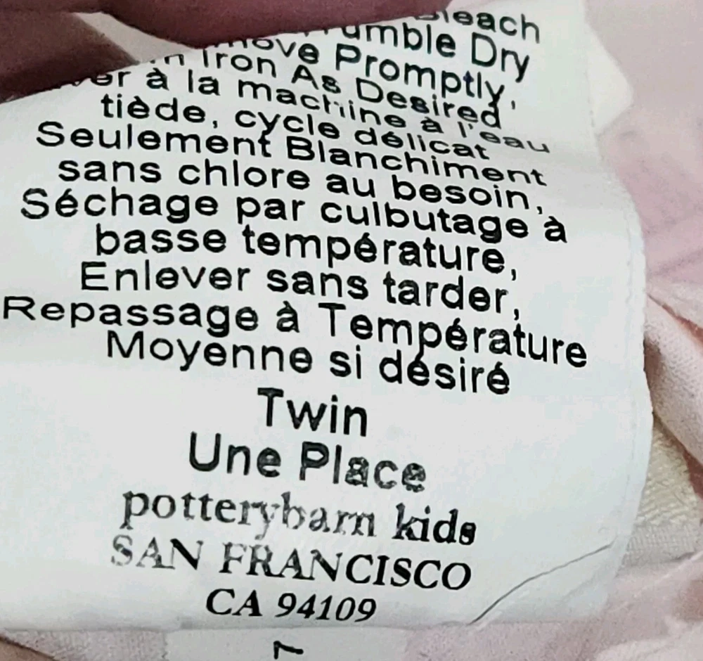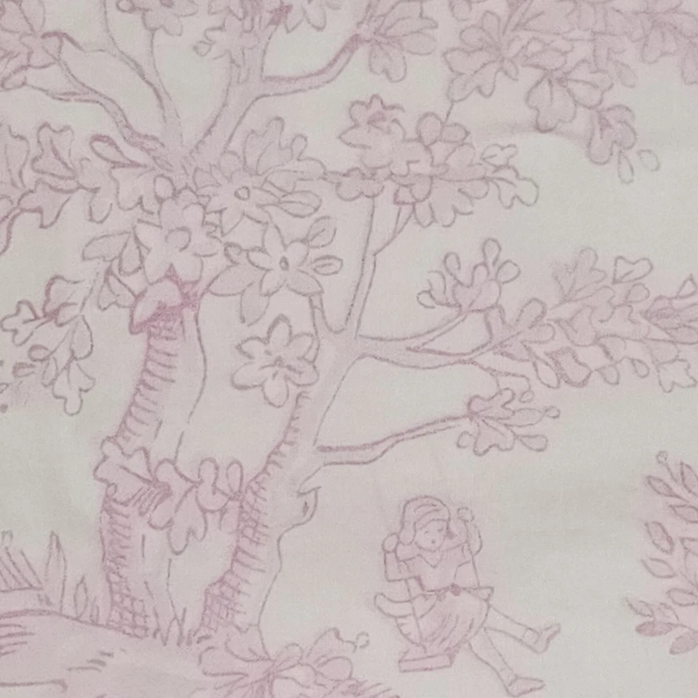 Pottery Barn Kids Pink Isabelle Floral Cotton Twin Bed Duvet Cover Toile pattern with Children playing outside under Trees . Double sided slightly different in colors on each side. background is pink on one side white on the other with the same print of children, button closure at the bottom, seems to have been used gently no problems seen with it, from 2008 per the tag.