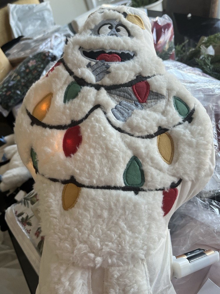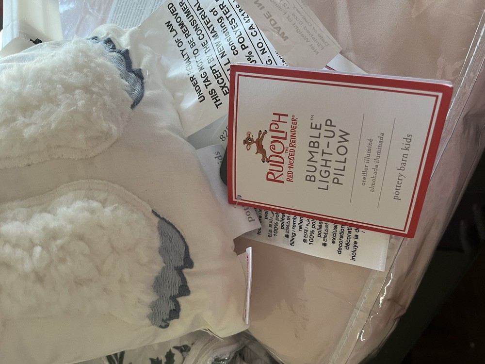 Up For Auction is - Pottery Barn Kids Rudolph Bumble Pillow light up Christmas Holiday New w tag Pillow is made from 100% cotton percale; reverses to the same fabric. Pillow is filled with 100% polyester batting and sewn shut. Features satin stitch appliques on front of pillow. Pillow reverses to solid Ivory. Pillow lights up and includes 12 LED bulbs in white. Punch to activate twinkling lights; lasting for 30 seconds. Yarn-dyed fiber has incredibly rich color that holds its vibrancy over time. Overall: 12" wide x 16" high Fill Weight: 0.5 lbs Weight: 1 lbs
