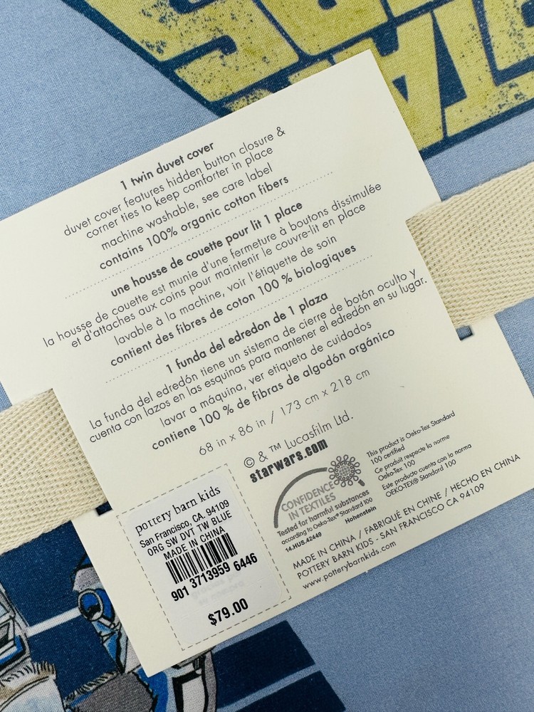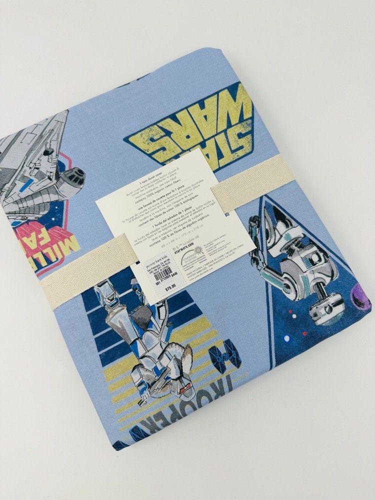 This is a Pottery Barn Kids Star Wars Han Solo organic duvet cover in twin size. The duvet cover features a Star Wars theme with a multi-color design. It is made of 100% cotton, includes buttons for closure, and is machine washable. Perfect for a Star Wars themed bedroom for kids.