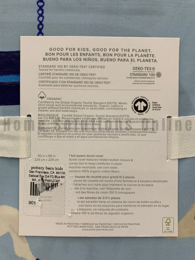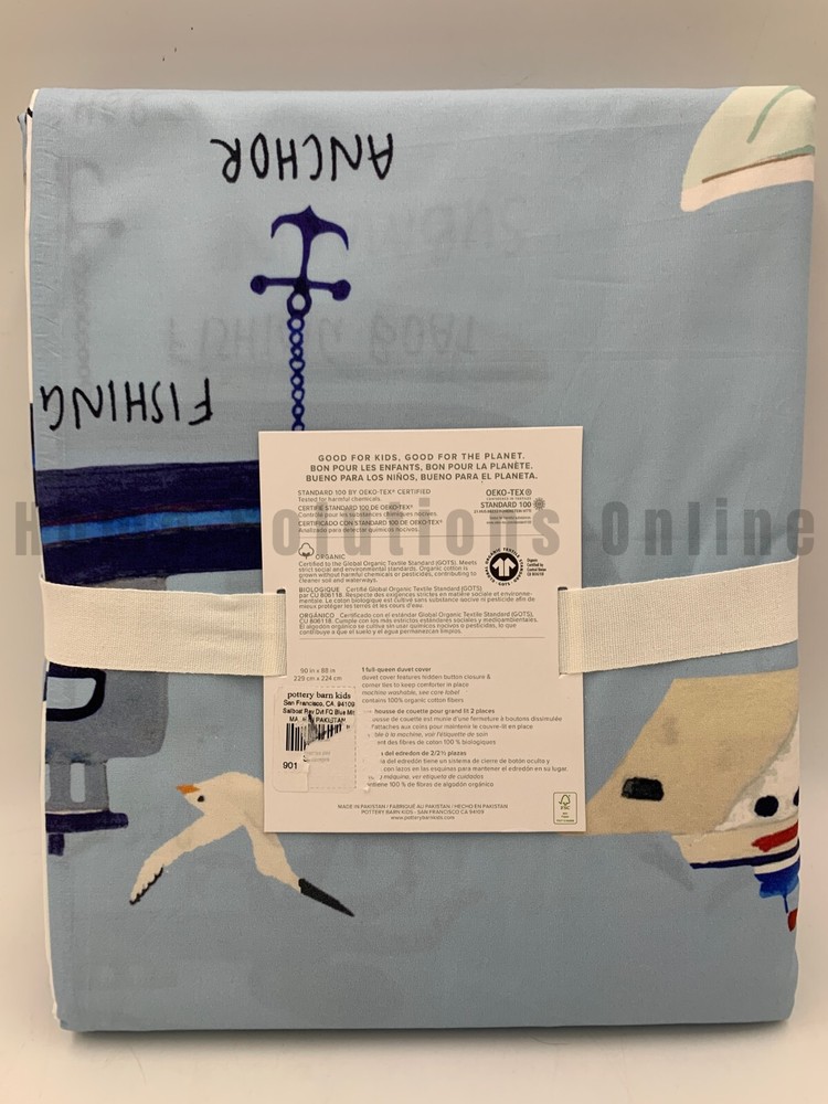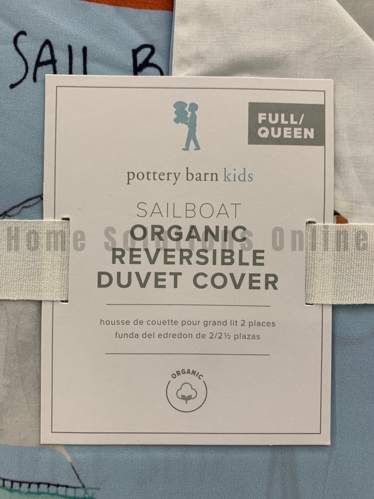 Pottery Barn Kids Sailboat Organic Reversible Duvet Cover Item is brand new Auction includes: 1 duvet cover DIMENSIONS: Duvet Cover Twin: 68" wide x 86" long Full/Queen: 88" wide x 90" long Shams Standard: 26" wide x 20" high CARE: Wash bedding before first use. Machine wash in warm water; gentle cycle. Use only non-chlorine bleach, if needed. Tumble dry on low heat. Warm iron as needed.
