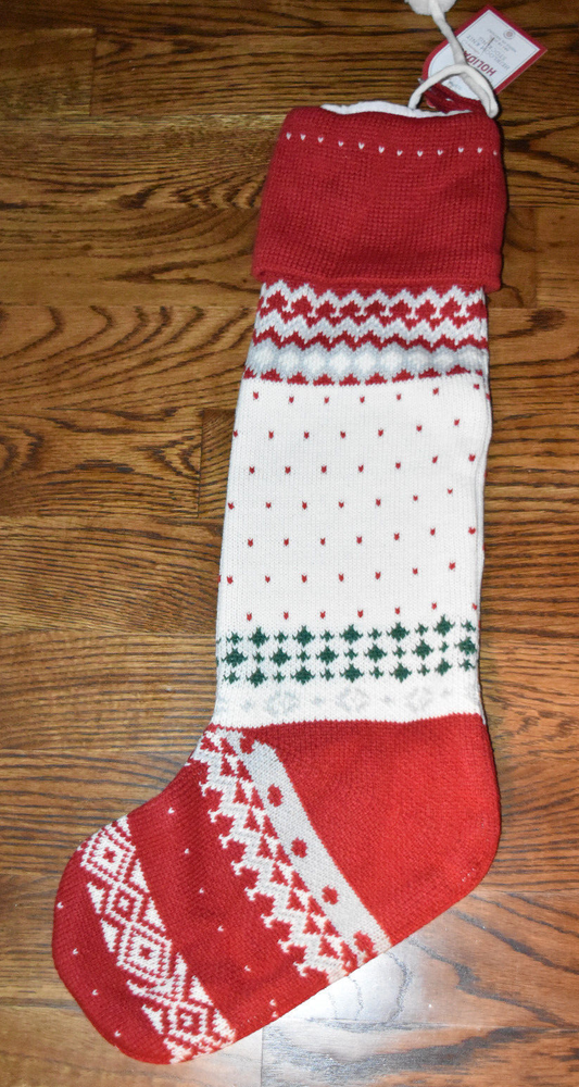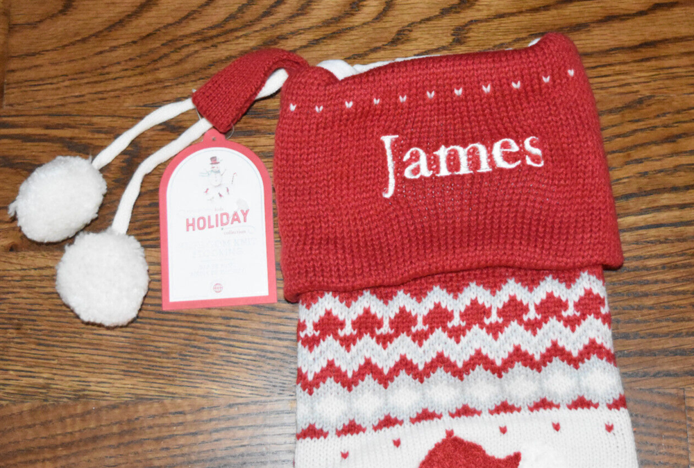 Has James embroidered with white thread. For the coziest Christmas, decorate the hearth with sweet stockings inspired by heirloom knits. Crafted of supersoft yarn-dyed wool and acrylic, they feature classic snowflakes, dots and borders, plush pom poms and festive embellishments. This stocking features detailed and playful winter scenes and characters with touchable 3-D details and embroidery. Appliques and embroidery details are stitched by hand from cotton and polyester. Stocking is made of 50% wool and 50% acrylic, lined with 100% cotton. Yarn-dyed – Fibers are treated individually with environmentally safe dyes before weaving to offer vibrant, lasting colors. STANDARD 100 by OEKO-TEX® Certified: tested for 350+ harmful substances to keep you and your family safe. Machine wash. Imported. Dimensions Overall: 7" wide x 27" long Cuff: 5" high Length from top of cuff to heel: 27" long Length from heel to toe: 11" long Hanging Loop: 3" long Weight: 0.5 pounds Care Machine wash in cold water; gentle cycle. Tumble dry on low heat; remove promptly. Iron on lowest setting, if needed. Do not dry clean.