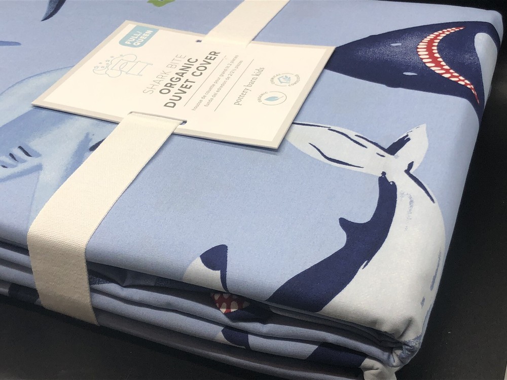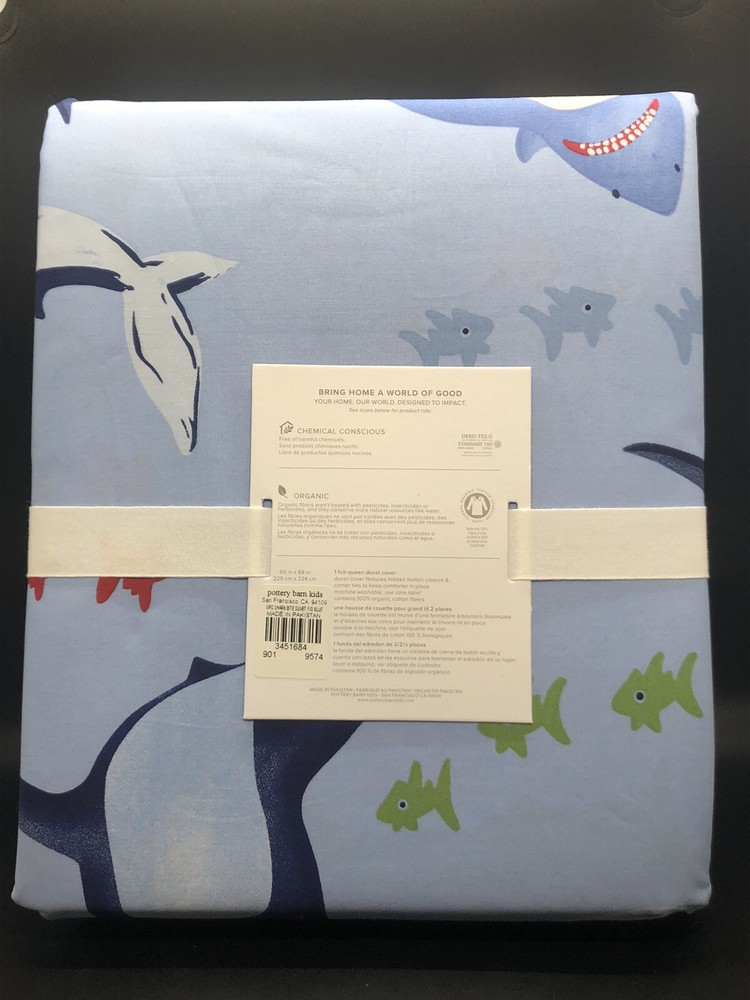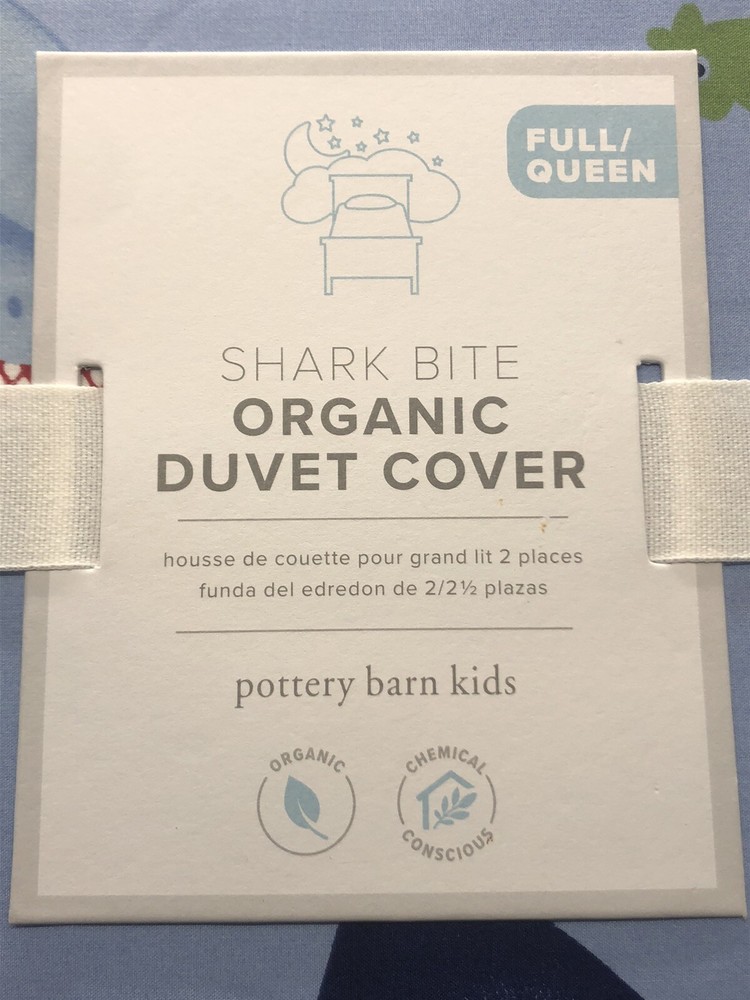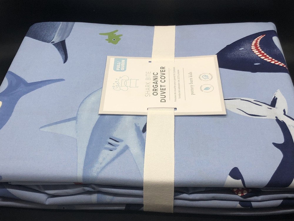 Brand new with tags NWT Pottery Barn Kids SHARK BITE Full / Queen Duvet Cover, measuring 90” x 88”. Blue Ocean Beach Fish Sea with sharks, perfect for an ocean lover or a beach house. Message me with ...