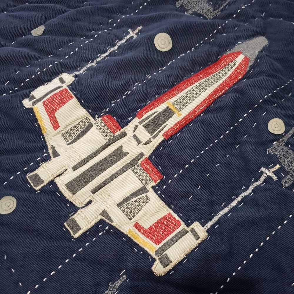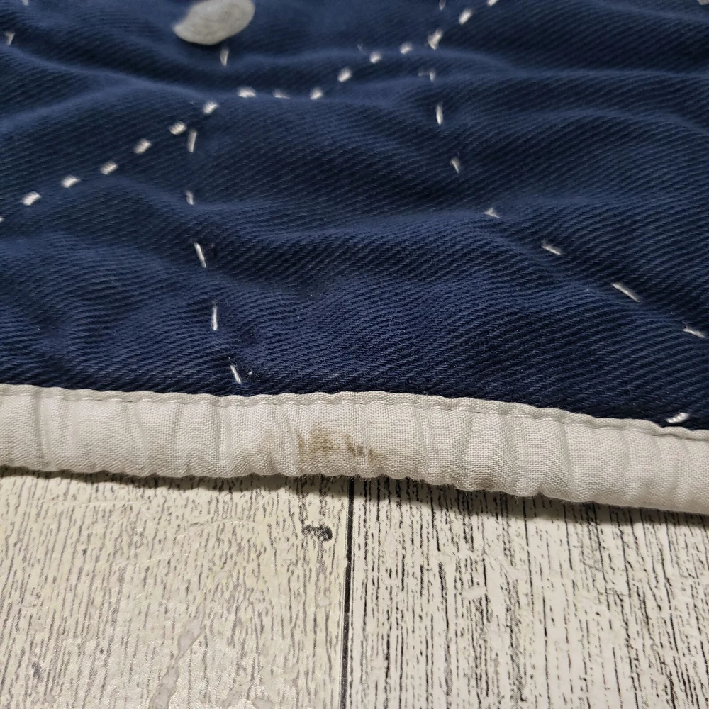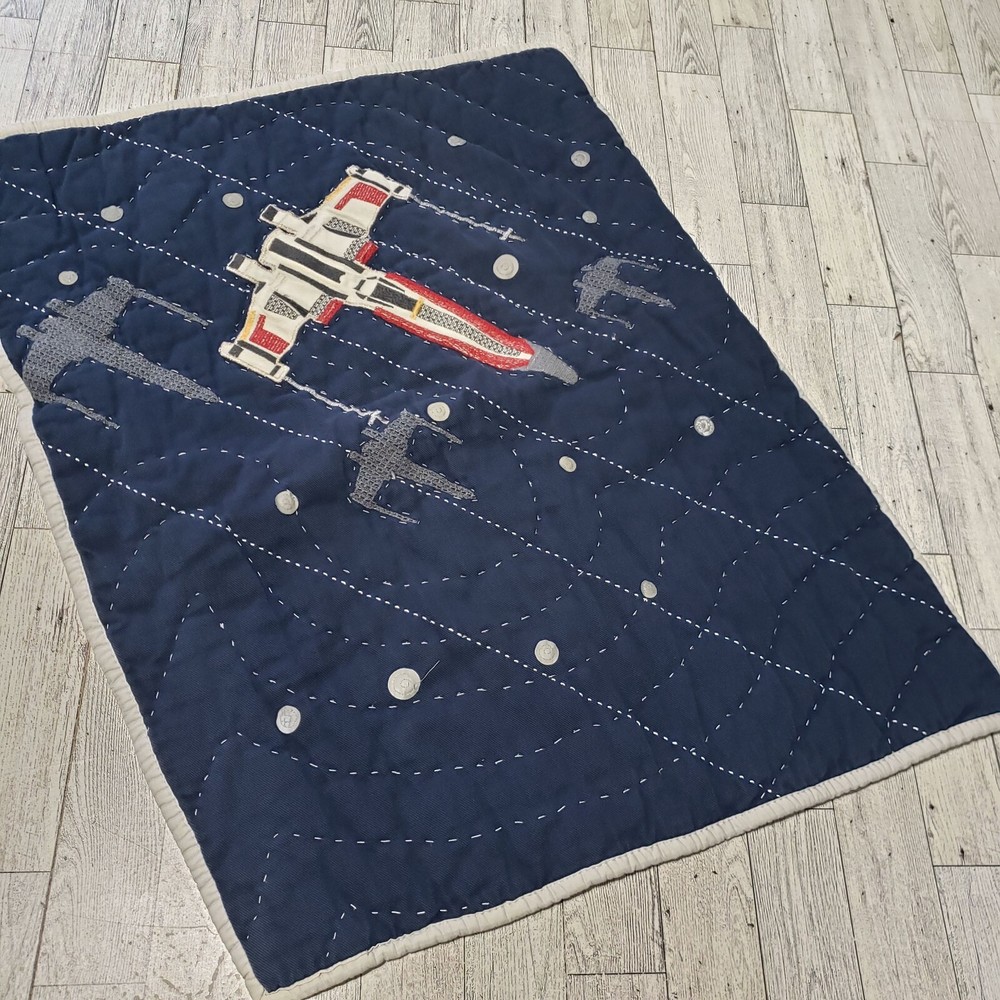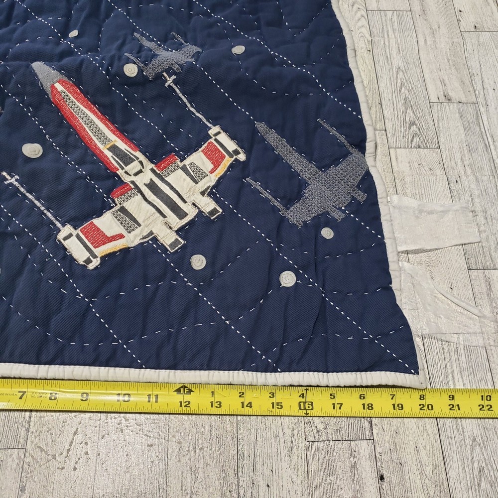 The Pottery Barn Kids Star Wars X-Wing Quilted Pillow Sham Case Cover is a stylish and fun addition to any kid's bedroom. This blue quilted sham features a patchwork design with an X-Wing theme from Star Wars, perfect for young fans of the space saga. The standard size of 25" x 20" fits perfectly on most pillow inserts, bringing a touch of intergalactic style to bedtime routines. Made by Pottery Barn, known for high-quality home decor items, this pillow sham is both practical and decorative, making it a great choice for any young Star Wars enthusiast. This sham is in good condition. There is a small stain on the edge of the pillow. Please see photos for additional details.