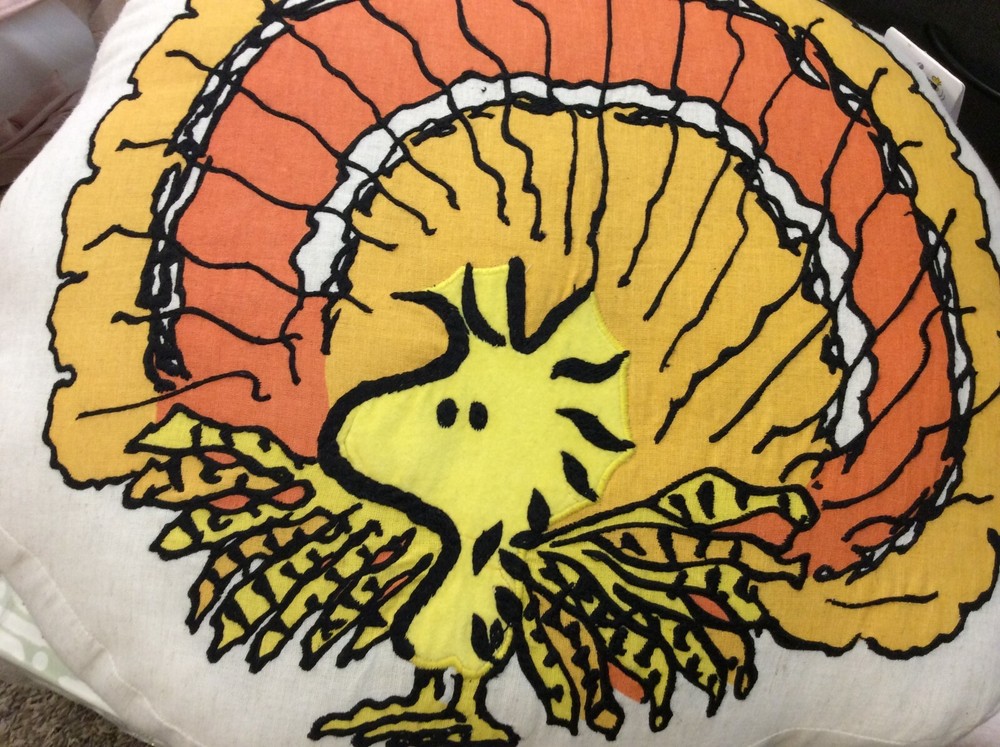 One (1) Complette Pillow from Pottery Barn Kids in the Woodstock Thanksgiving Turkey Peanuts Collection Front is made from 85% Cotton and 15% Linen. Reverses to solid. Overall: 16" h x 18.5" w Spot clean with soft, damp cloth. Blot to remove excess water. Air dry. New with Tags Smoke Free/Pet Free
